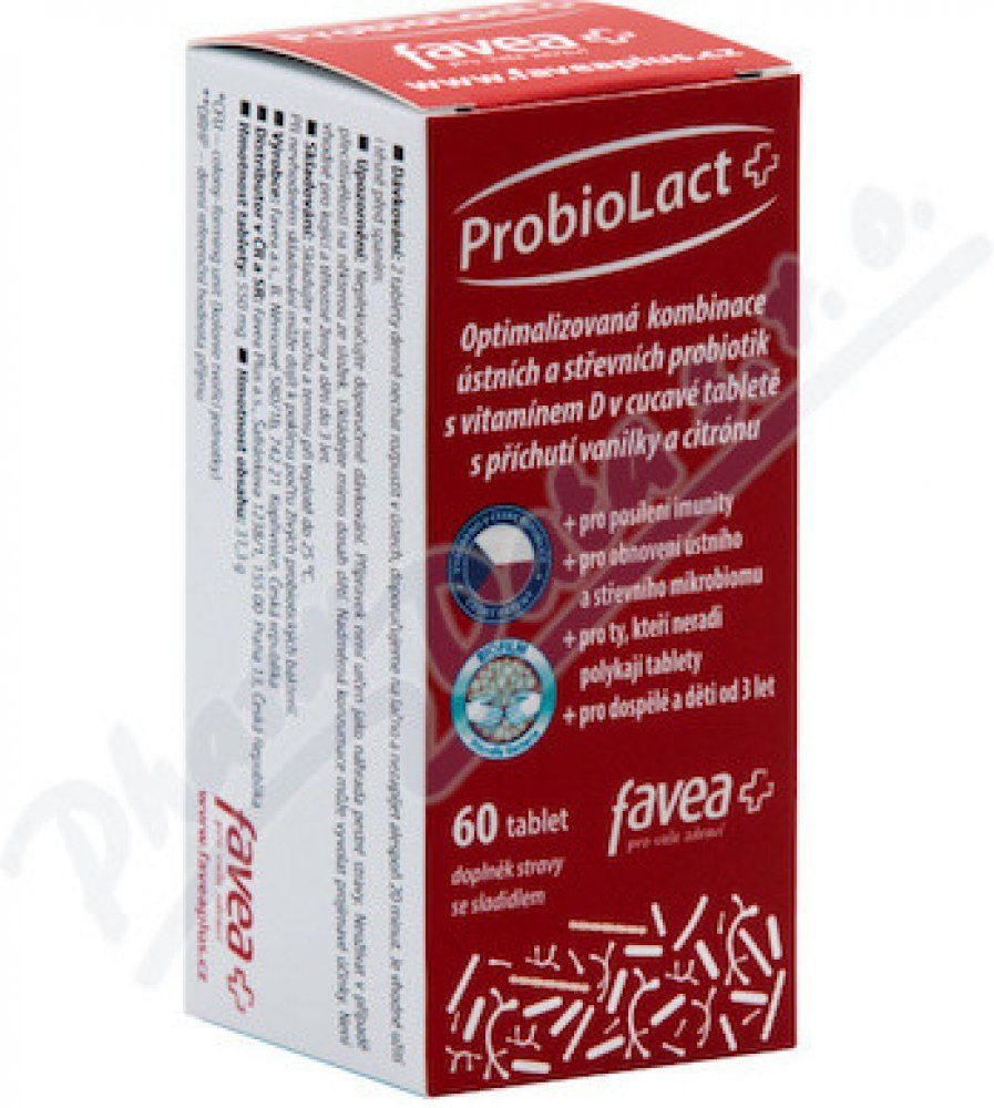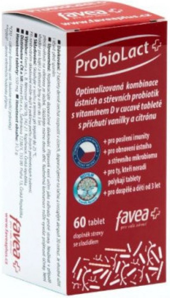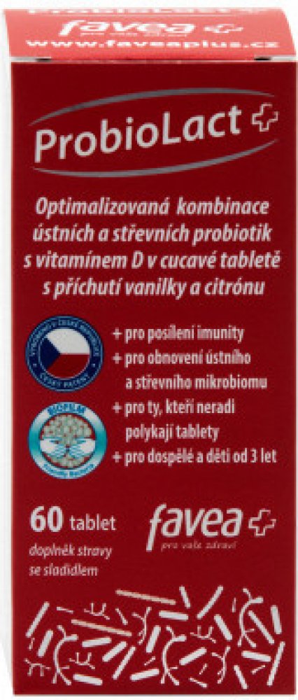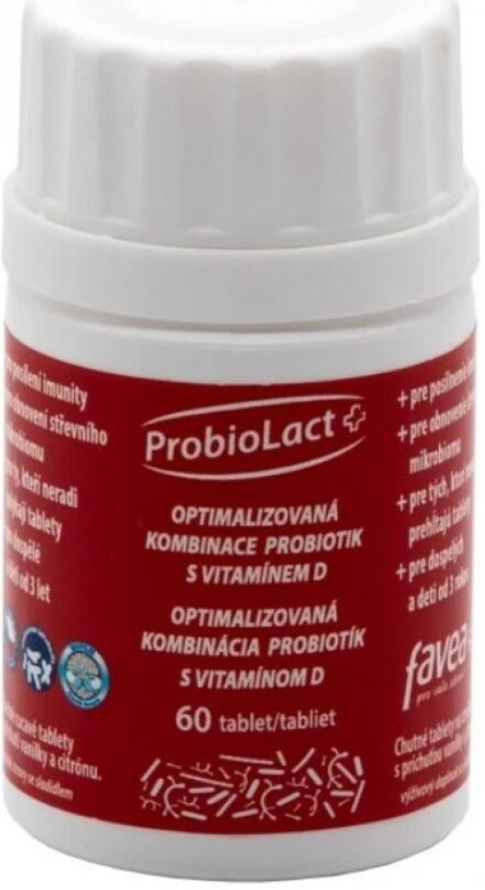 Favea ProbioLact Plus je doplněk stravy ve formě tablet. Výrobek je určený pro dospělé a děti od 3 let. Obsahuje vyvážený komplex 12 probiotických kmenů živých mikroorganismů v celkovém počtu 1 miliardy v tabletě a vitamín D pro normální funkci imunitního systému. Vitamín D také přispívá k udržení normálního stavu kostí a zubů.Bakterie Lactobacillus acidophilus biofilm je zpracována unikátní technologií do formy tzv. biofilmu. Biofilm je přirozená souvislá vrstva bakterií, které vytváří ochrannou a stimulační bariéru. Mikroenkapsulace â je patentovaná probiotická mikroenkapsulační technologie, která chrání probiotika proti náročným podmínkám v žaludku. Balení v dóze s desikantem zajišťuje stabilitu tablet po celou dobu použitelnosti.Vlastnosti:Obsahuje 12 různých probiotických kmenů v celkovém počtu 1 miliardy v tabletě.Obsahuje vitamín D, který přispívá k normální funkci imunitního systému a udržení normálního stavu kostí a zubů.Vhodný při užívání antibiotik a při cestování.Balení obsahuje 60 tablet.