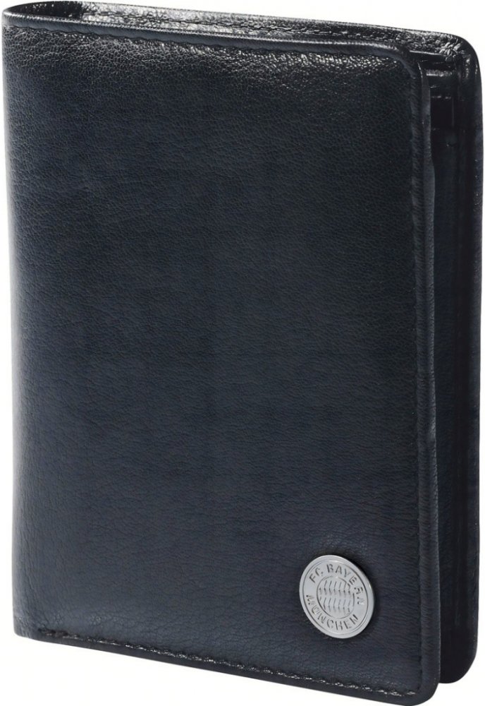 Kožená peněženka FC Bayern Mnichov. Pravá kůže v černé barvě. Na přední straně připevněn kovový znak slavného klubu. Uvnitř se nachází hlavní přihrádka na bankovky rozdělená na dvě části. Kapsička na mince se zapíná na cvoček. Dále jsou ve vnitřním prostoru tři přihrádky na karty a osobní doklady a jedna kapsa na zip uprostřed. Balená v dárkové krabičce.