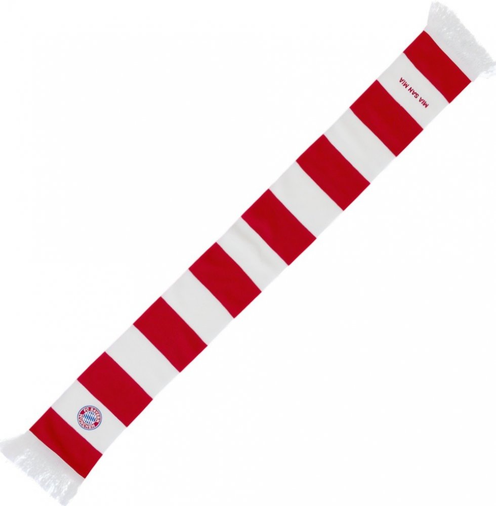 Šála FC Bayern Mnichov v kombinaci červené a bílé barvy. Pruhovaná. Nápis MIA SAN MIA v kontrastní barvě. Zakončena třásněmi. Příjemný materiál.