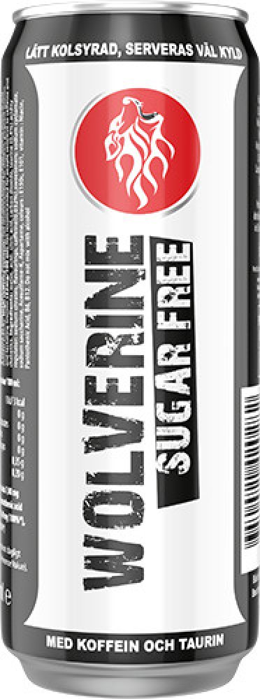 Wolverine sycený nápoj s guaranou. Pasterizováný. Složení: voda, cukr, kyselina (kyselina citronová), oxid uhličitý, regulátor kyselosti (citráty sodné), extrakt z guarany, aroma, barviva (Amoniakový karamel, Riboflavin), vitamíny (kyselina pantotenová, vitamín B6, biotin, vitamín B12). Spotřebujte do: viz spodek plechovky. Skladujte na chladných a suchých místech.