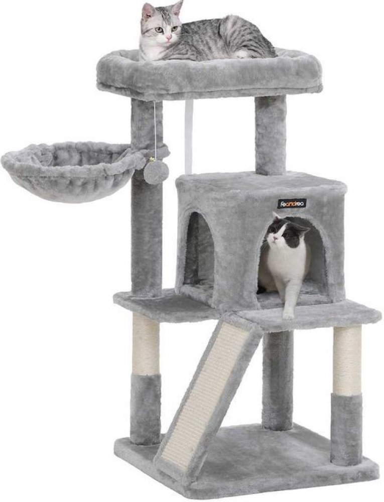 Kočičí strom Robert o výšce 96 cm uvítá i větší nebo baculatější kočky. S rozšířeným posedem pro kočky o rozměrech 45 x 30 cm se může vaše kočka konečně natáhnout a pohodlně relaxovat. Plné okraje a měkký košík na ležení posouvá pohodlí na zcela novou úroveň! Škrabací rampa 2 v 1: se škrabací deskou a žebříkem v jednom. Toto škrabadlo pro kočky nejenže umožní vašim kočkám škrábat se do sytosti, ale pomůže i koťatům, starším kočkám a dokonce i kočkám s problémy s pohyblivostí snadno vylézt nahoru. 2 dveřová jeskyně pro kočky: Tato jeskyně pro kočky, navržená se 2 dveřmi, umožňuje vaší kočce snadno vstoupit a vystoupit nebo přejít do nadýchaného koše pro kočky a zároveň vaší kočce umožní lépe se natáhnout. Robustní materiál, bezpečné hřiště: Pevná dřevotřísková deska pro odolnost, zesílená základna pro extra stabilitu a sada proti převrácení pro bezpečnost – tento kočičí byt se škrabadly nabízí bezpečné hřiště až pro 3 kočky (max. 7 kg každá). Designové: Svou nenápadnou barvou zapadne strom Robert do každé domácnosti. Ve vyvýšeném domečku se vaše kočka může klidně ukrýt, když zrovna nebude mít náladu na hraní nebo mazlení. Výhody produktu: vysoká stabilita; má základní desku vyztuženou dřevem robustní kmeny potažený nadýchaným, mimořádně odolným plyšem útulný domeček pro kočky se škrabací deskou a žebříkem v jednom velkorysá, robustní houpací síť bezpečné hřiště až pro 3 kočky Technické údaje: Barva: světle šedá Materiál: dřevotříska, tvrdý karton, plyš, sisal Velikost: 48 x 48 x 96 cm (D x Š x V) Hmotnost: 11,6 kg Obsah balení: 1 x škrabadlo 1 x návod