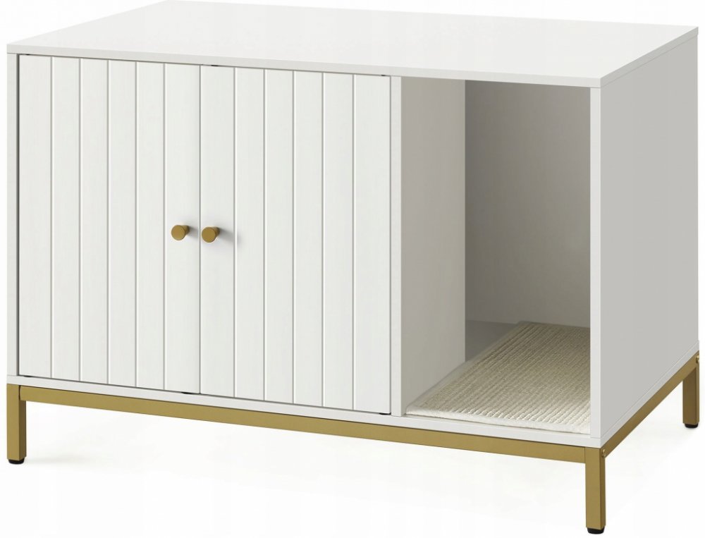 Moderní skříňka pro kočky, která kombinuje funkčnost s elegantním designem a dokonale ladí s jakýmkoli interiérem. Díky bílému provedení a zlatému kovovému rámu představuje stylový prvek výzdoby a zároveň skrývá záchod a zajišťuje kočce soukromí. Kroucený vchod podněcuje přirozenou zvědavost mazlíčka a škrabací podložka u vchodu umožňuje obrušování drápků a zadržuje stelivo. Prostorná komora (52 x 50 x 41,9 cm) se hodí pro většinu záchodů a přední vchod usnadňuje umístění skříňky kdekoli. Může sloužit jako domeček pro kočky, elegantní konferenční stolek nebo stojan pod televizi. Vysoké nohy umožňují snadné čištění podlahy a dvojité dveře minimalizují rozsypání steliva. Prostorná pracovní deska poslouží jako místo pro dekorace, knihy nebo pohodlné pelíšek pro vašeho mazlíčka. Ideálně se hodí pro majitele, kteří oceňují estetiku a funkčnost v jednom.