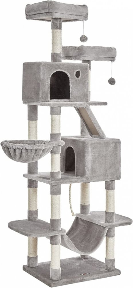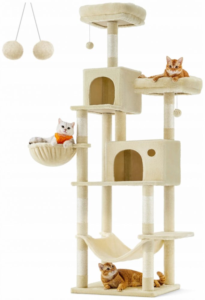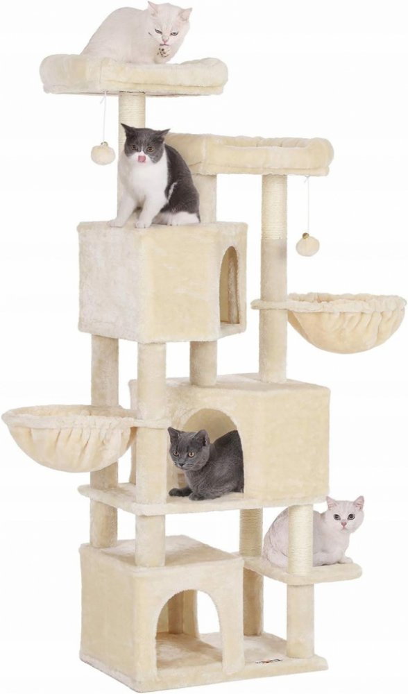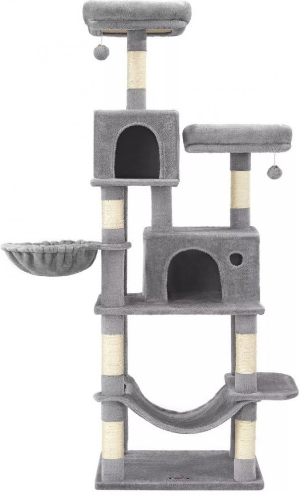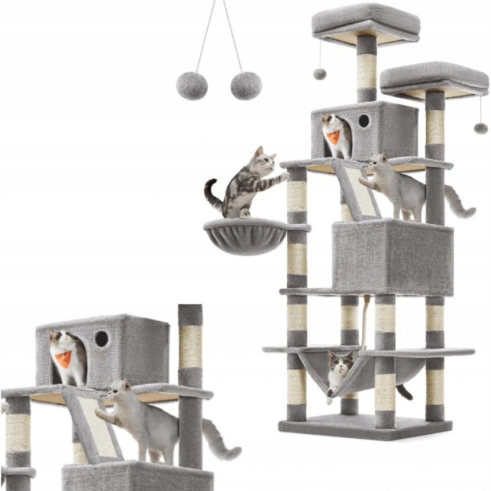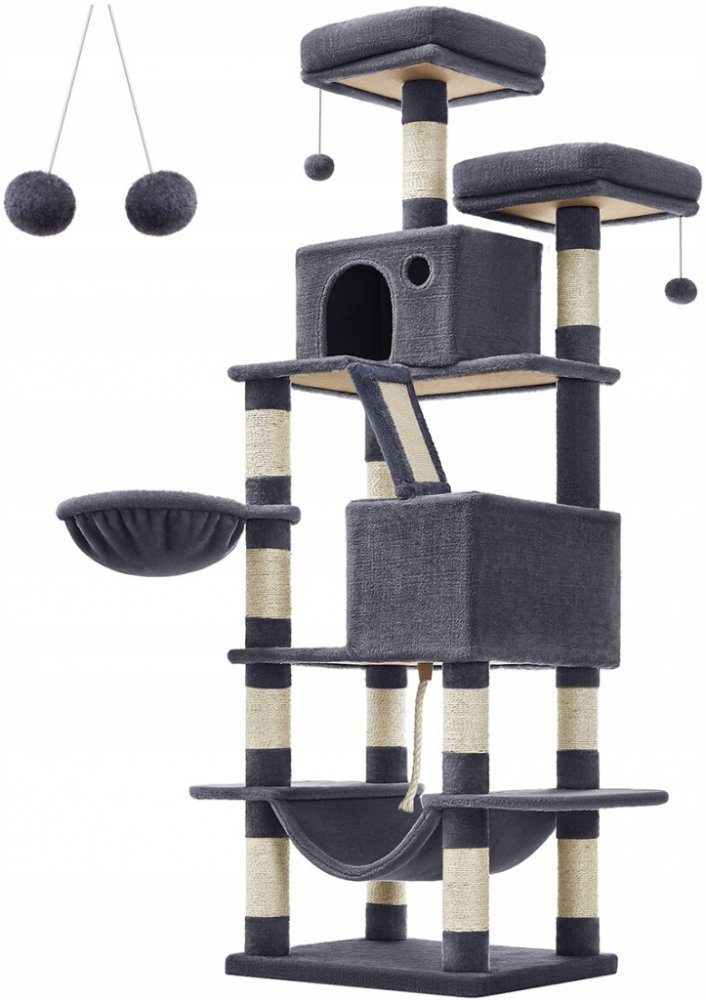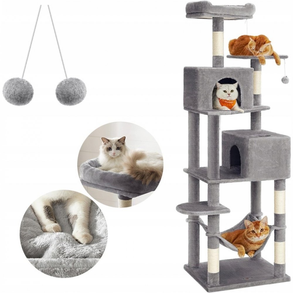 Multifunkční velké škrabadlo pro kočky bude opravdovým rájem, který nemá rád nudu. Tento víceúrovňový škrabák je navržen s ohledem na potřeby a pohodlí koček a představuje nejen skvělé místo pro trhání drápků, ale také prostor pro hraní, odpočinek a pozorování okolí. Dva úložné prostory ve tvaru jeskyní jsou ideálním místem k úkrytu a odpočinku, aby mazlíček mohl najít klid a bezpečnost v těchto útulných prostorech. Pohodlný koš a relaxační houpací síť jsou dalšími prvky, díky kterým se kočka bude cítit pohodlně a relaxovat naplno, a plyšové míčky zajistí další zábavu a povzbudí k aktivitě. 13 různých míst pro trhání drápků zajistí kočce nekonečnou zábavu a možnost zachování zdravých nehtů a ušetří tak oblíbený nábytek. Vyrobený v odstínu světle šedé barvy z MDF a přírodní sisalové lanko, které bylo opleteno na instinktivních místech, vydrží nejednu ostrou pazúru.