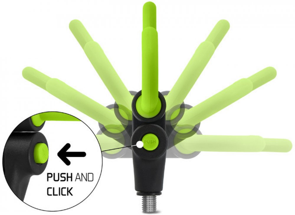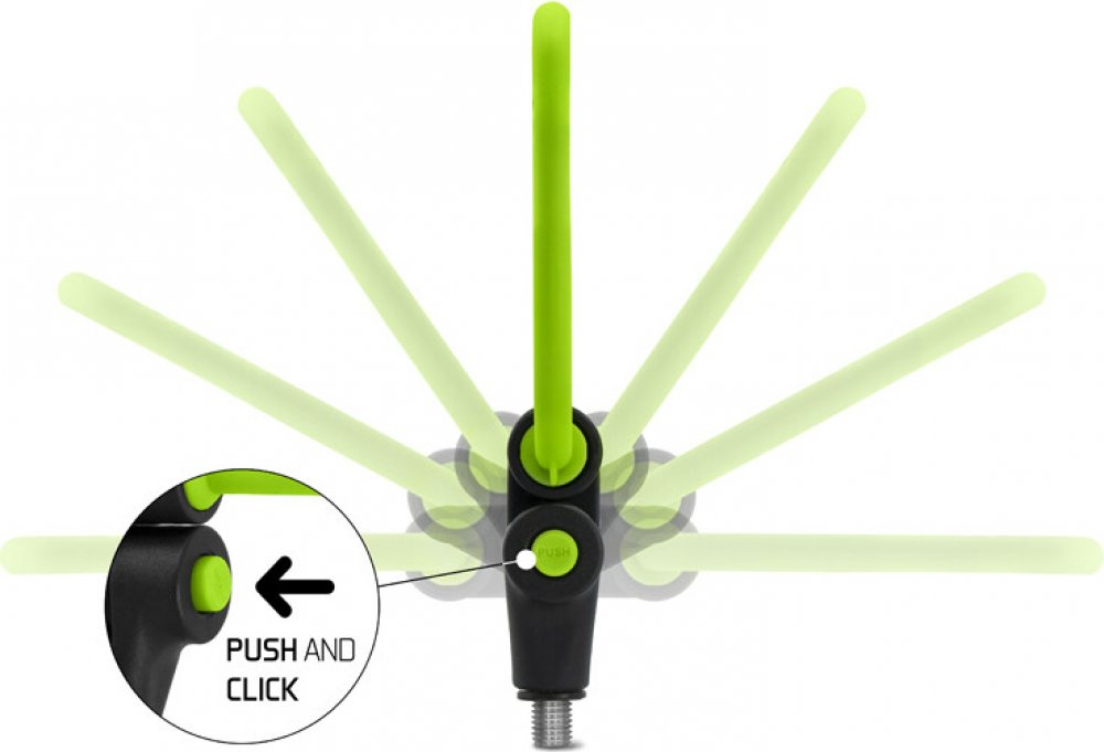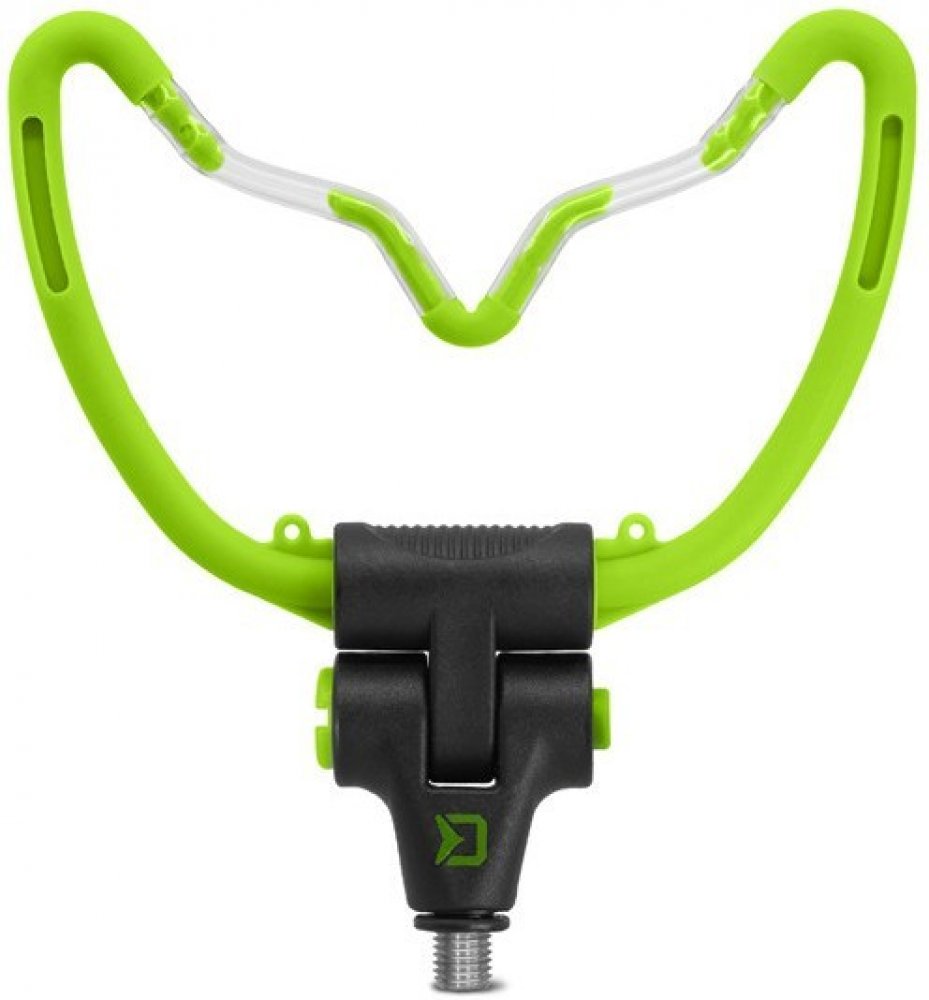 Šířka ramen je 14,5cm. Užitečným doplňkem držáku jsou očka pro uchycení háčku, do kterých můžete zachytit háček například při plnění feederového košíku. Držák má na těle umístěny 4 otvory pro chemické světlo, což oceníte zejména při nočním rybolovu.