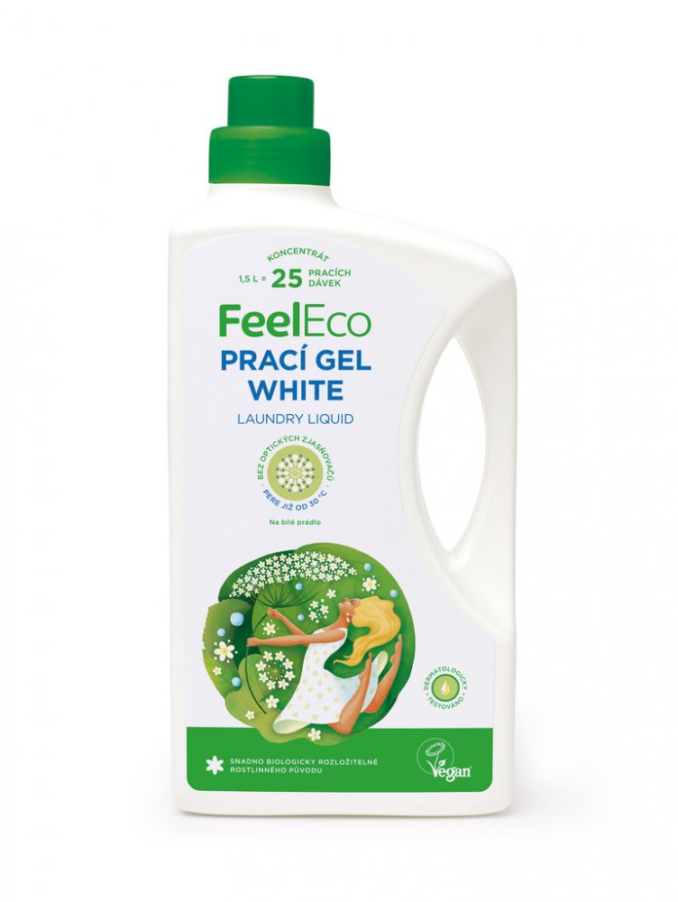 Prací prostředek řady Feel Eco white má speciálně vyvinuté složení, které svou prací účinností patří mezi nejkvalitnějších prací prostředky na trhu. Díky vysokému obsahu enzymů a účinných složek pere výborně už při teplotě 15 °C. Použité povrchově aktivní látky jsou snadno biologicky rozložitelné a jsou vyrobeny převážně z rostlin. Je vhodný pro všechny tvrdosti vody. Zachová prádlo zářivě bílé. Výborně chrání prádlo před poškozením, vlákna se nezanášejí nerozpustnými částicemi, nedochází k inkrustaci a ztvrdnutí vláken. Výrobky jsou baleny do recyklovatelných obalů. Neobsahuje fosfáty.