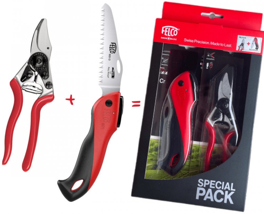 Dárkový set s profesionálními nůžkami FELCO 6 pro menší ruku a zavírací pilkou FELCO 601 – to celé v hezkém dárkovém balení! Dva kusy úžasných nástrojů oceníte při práci na zahradě či ve vinohradu Ergonomické nůžky FELCO 6 Felco 6 – pro středně velké ruce, střih do průměru 20 mm, pro snížení vynaložené síly při stříhání a zabránění vzniku zánětu šlach jsou stříhací hlavice nůžek zkosené. Nůžky Felco 6 najdou uplatnění ve vinohradnictví, zahradnictví a ve školkách. Model pro středně velkou ruku Střih do průměru 20 mm Plná rukojeť z kovaného hliníku Délka 195 mm Hmotnost 210 g Spolehlivost: komfortní, lehká a robustní rukojeť z kovaného hliníku s doživotní zárukou. Ostří a protiostří vyrobeno z vysoce kvalitní tvrzené oceli . Čistý a precizní střih. Všechny díly snadno vyměnitelné. Vlastnosti: jednoduché a trvalé nastavení střihu. Odstřihovač drátu. Drážka pro odvod šťáv. Ergonomie: díky ideálnímu tvaru rukojeti, dorazům s tlumícím účinkem šetří ruce a zápěstí. Protiskluzová úprava rukojeti. Zavírací pilka FELCO 601 Rovný plátek s délkou 120 mm Řez do 50 mm Hmotnost 140 g Velmi kompaktní rozměry Indukčně kalené zuby pro dlouhou ostrost Bezpečnostní pojistka proti nechtěnému zavření pilky Nehetník pro pohodlné otevírání pilky Rukojeť s povrchem souft-touch a skvělou ergonomií Chromová úprava plátku proti korozi Spolehlivost: Vysoce kvalitní japonský plátek s chromovou úpravou proti korozi. Čistý, rychlý a precizní řez. Vyměnitelné díly. Vlastnosti: Hroty zubů jsou impulzně kalené, díky čemuž vydrží pilka extrémně dlouho ostrá. Perfektní geometrie zubů. Nehetník pro pohodlné otevírání pilky i jednou rukou. Pojistka proti nechtěnému zavření pilky. Ergonomie: komfortní, ergonomická rukojeť s vrstvou soft-touch pro pohodlný úchop bez klouzání v ruce