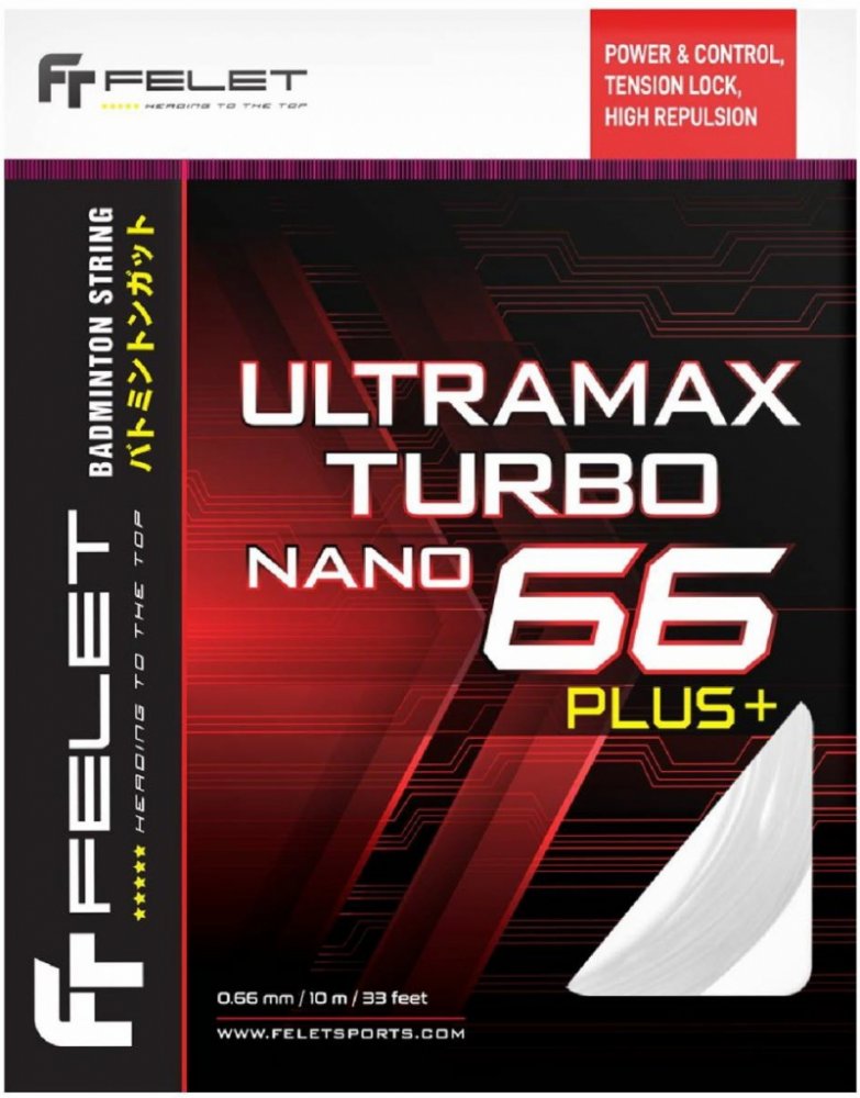 Felet Ultramax Turbo Nano 66 je výkonný badmintonový výplet z profesionální série Nano, který kombinuje nejnovější materiály, pokročilou konstrukci a japonskou technologii. Výplet je určen pro hráče, kteří chtějí dosáhnout maximální přesnosti, výdrže a zpětné energie při úderu – bez kompromisů v herním pocitu.