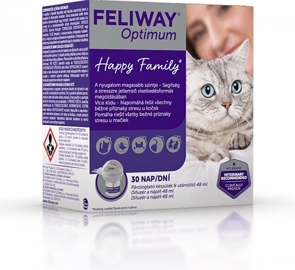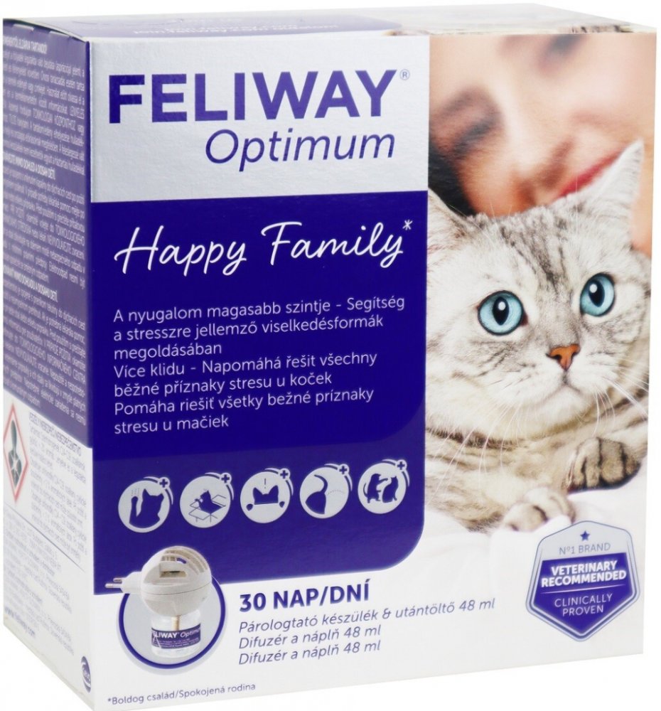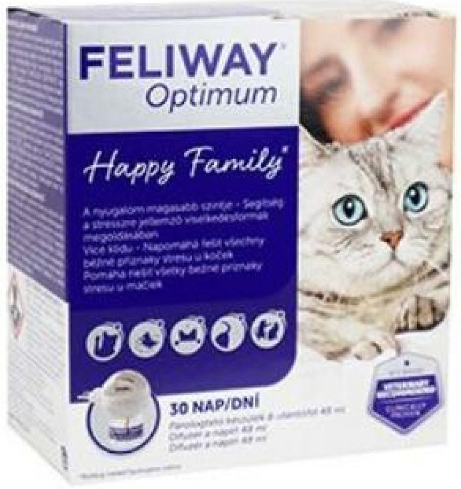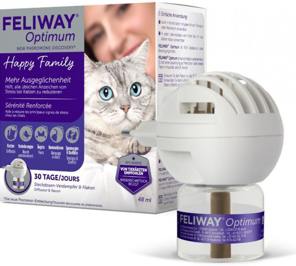Odpařovač se zapojí do zásuvky a do vzduchu uvolňuje inovativní kombinaci feromonů, která zvyšuje harmonii a pocit bezpečí. Látka je detekovatelná pouze u domácích mazlíčků a nemá žádný vliv na ostatní domácí zvířata. Pro lidi je Feliway® Optimum bez zápachu, a proto není dráždivý. Jeho účinnost byla vědecky prokázána a Feliway® Optimum je doporučován veterináři proti známkám stresu, jako je značkování močí, schovávání, nadměrné škrábání a vyčesávání. Může také pomoci snížit napětí a konflikty mezi domácími zvířaty a usnadnit proces seznamování s novou kočkou. Feliway® Optimum lze použít i ve veterinární ordinaci, aby se domácí zvířata cítila pohodlněji.