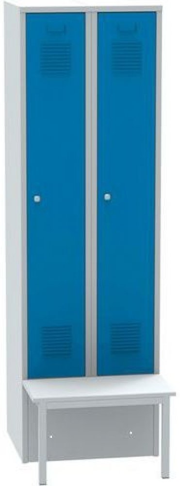 Šatní skříňka s lavicí vhodná do školních a pracovních šaten či na sportoviště.Skříně jsou vybavené vrchní policí a tyčí se třemi plastovými háčky pro odkládání oděvů.Konstrukce z ocelového plechu tl. 0,7 mm.Dveře zavěšené na vnitřních pantech, opatřené perforací pro cirkulaci vzduchu.Štítky na dveřích pro umístění jmenovky.Jednobodové uzamykání cylindrickým zámkem.Povrchová úprava práškovou barvo...