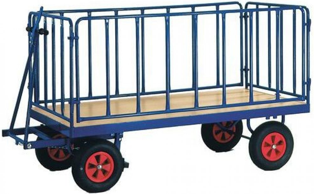 Manipulační vozík s pevnou ocelovou konstrukcí, velkou ložnou plochou a čtyřmi mřížovými stěnami.Ložná plocha je vyrobena z laminované dřevotřísky.Stěny jsou vysoké 77 cm, boční lze odejmout, čelní stěny jsou pevné.Pohyb zajišťují čtyři dušová kola s valivými jehlovými ložisky, z nichž dvě jsou pevná a dvě otočná.Kola jsou široká 85 mm a jsou vybavena ochrannými kryty.Zvednutím táhla dojde k zabrzdění předních otočných kol.Povrchová úprava práškovým lakem.