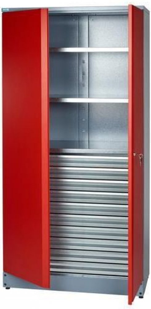 Uzamykatelná kovová skříň se třemi výškově nastavitelnými policemi a s deseti zásuvkami je vyrobená z ocelového plechu. Pro větší bezpečnost jsou dveře vyztuženy profilovanými výztuhami. Skříň je dodávána v demontovaném stavu se spojovacím materiálem.rozměry v x š x h: 180 x 91 x 45 cmmateriál: ocelový plech tl. 1 mmnosnost na polici: 75 kgnosnost zásuvky: 30 kgpočet polic: 3 kspočet zásuvek: 10 ksvýška zásuvky: 7 cmvýsuv zásuvek: 100 %barva: stříbrnábarva dveří: červená RAL 3002hmotnost: 111 kgpolice stavitelné v rastru 25 mm, povrchová úprava pozinkováním, možnost uzamčení (cylindrický zámek), dodáváno v demontovaném stavu (spojovací materiál součástí balení)