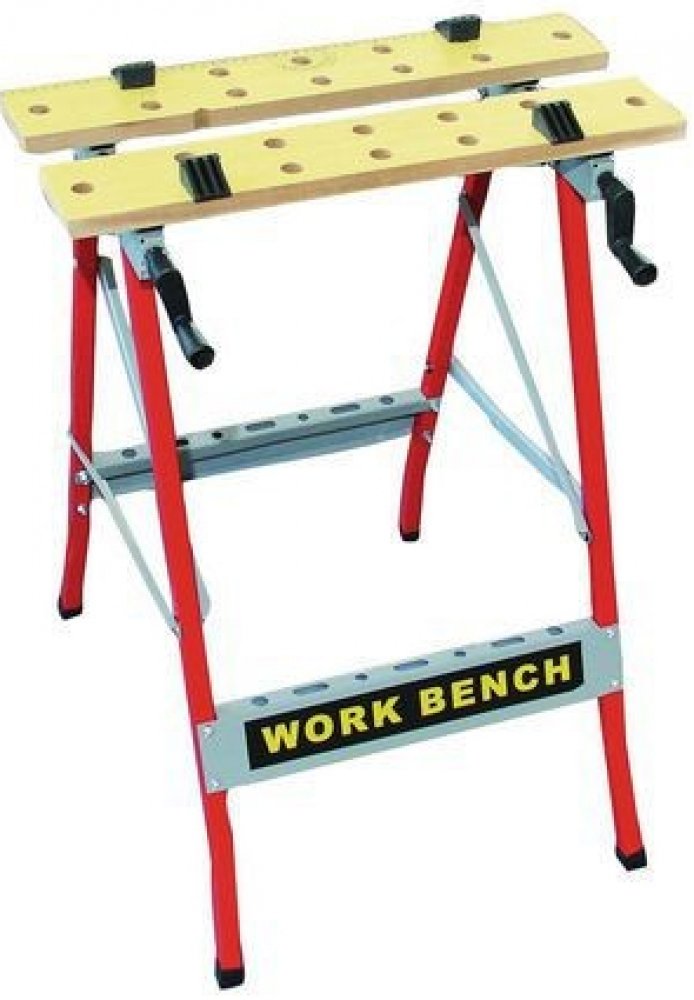Pracovní stůl s ručními kličkami k posuvu pracovních desek. Plastové dorazy k upnutí materiálu. Nohy pracovního stolu jsou opatřeny plastovými kryty pro ochranu podlahové krytiny. Výhodou je snadná manipulace, praktické skladování a zpevněný lichoběžníkový stojan.rozměry v x š x h: 80 x 61 x 24 cmmateriál pracovní části: dřevomateriál konstrukce: ocelnosnost: 100 kg