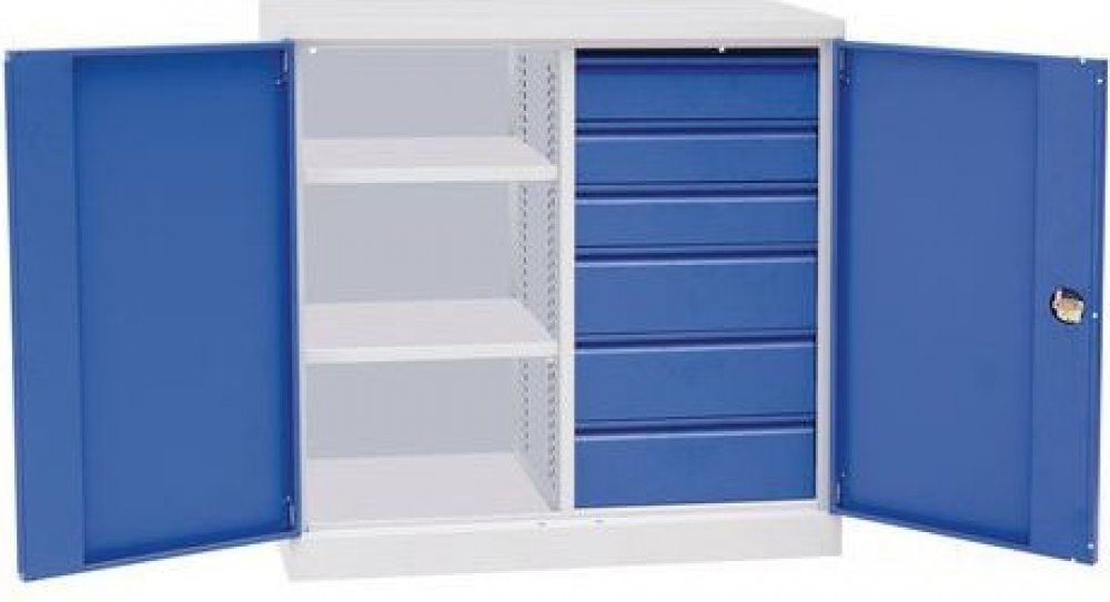 Dílenská skříň je vhodná pro uložení pracovních nástrojů a pomůcek. Skříň je vybavena dvěma výškově stavitelnými policemi a šesti zásuvkami s výškou 87, 109 a 155 mm. Police je přestavitelná v rastru 20 mm.Zásuvky jsou umístěny na kuličkových výsuvech.Vyrobena z plechu tl. 0,9 mm.Upevňovací materiál není součástí balení.