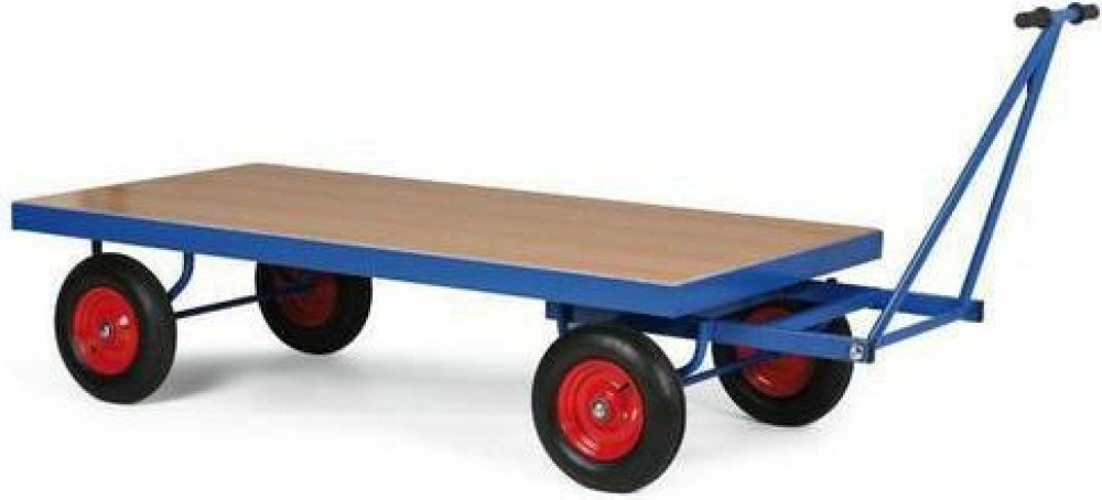 Manipulační vozík s pevnou ocelovou konstrukcí, ojí a velkou ložnou plochou.Vhodný k přepravě rozměrných břemen.Ložná plocha je vyrobena z laminované dřevotřísky.Pohyb zajišťují čtyři dušová kola s valivými jehlovými ložisky, z nichž dvě jsou pevná a dvě otočná.Kola jsou široká 78 mm a jsou vybavena ochrannými kryty.Zvednutím táhla dojde k zabrzdění předních otočných kol.Povrchová úprava práškovým...