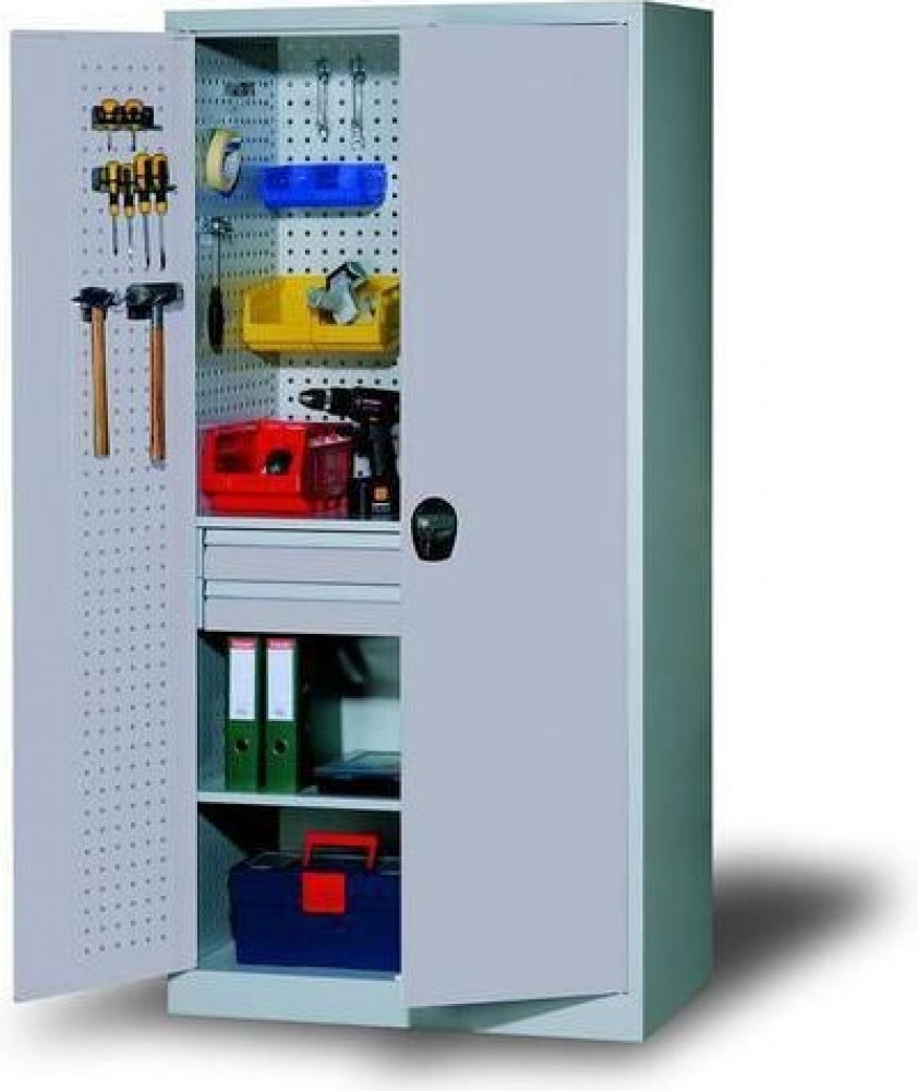 Dílenské skříně se dvěma policemi a dvěma zásuvkami jsou vyrobeny z ocelového plechu, tl.1 mm.Zadní část kovových skříní i dveře jsou opatřeny perforovanými panely pro uchycení držáku nářadí a boxů.Plechové skříně je možné uzamknout cylindrickým dvoubodovým rozvorovým zámkem.Úhel otevření dveří je 110°.