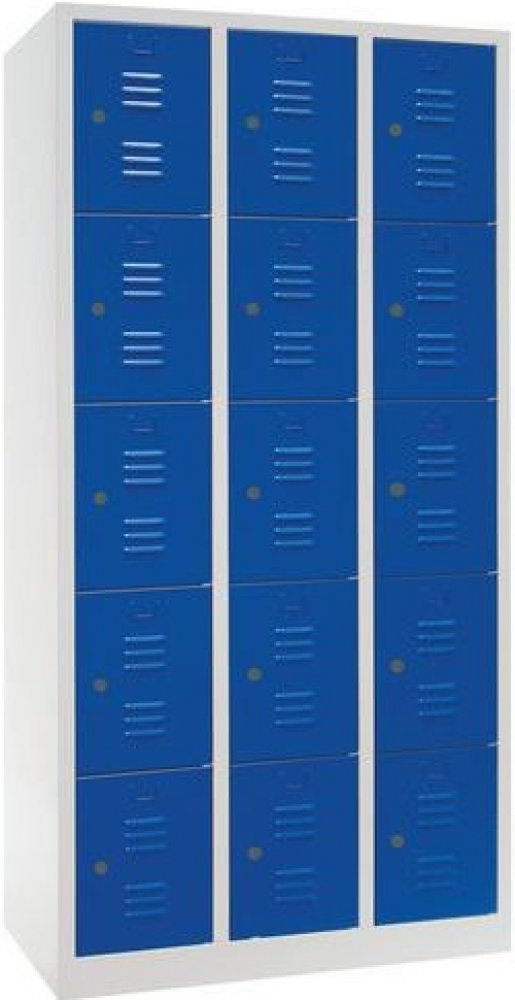 Kovové šatní skříně s patnácti boxy vhodné pro odkládání osobních věcí zaměstnanců a návštěvníků.Účinné odvádění vlhkosti z oděvů větracími otvory na dvířkách boxů.Dveře boxů jsou vyztužené a zavěšené na vnitřních pantech.Skříňku je možné připevnit ke zdi pomocí předvrtaných otvorů na zadní straně.Možnost umístění štítku se jménem v horní části dveří.