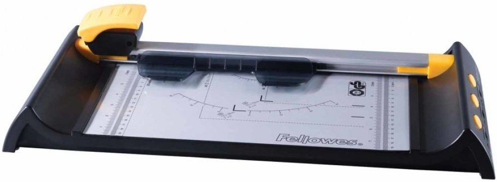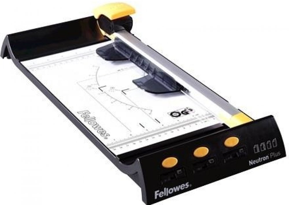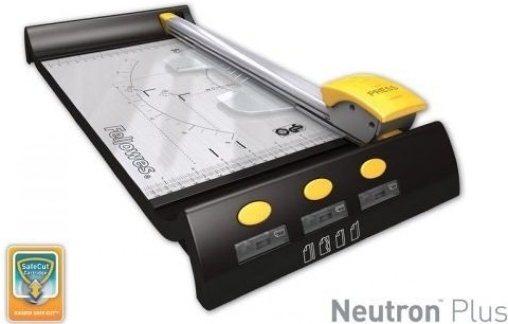 Řezačka papíru s plastovou základnou, velice atraktivní designv kombinaci černá žlutá. Kapacita řezání až 8 listů 80g papíru.Délka řezu 320 mm tj. formát A4. Řezání probíhá tlakem oproti gumovémupásku. Pásek lze dokoupit jako příslušenství (spotřební materiál).Rotační řezné kolečko lze po opotřebení dokoupit v sadě 2 ks.Řezačka Fellowes Neutron je určena pro široké spektrum uživatelův kanceláři ne...