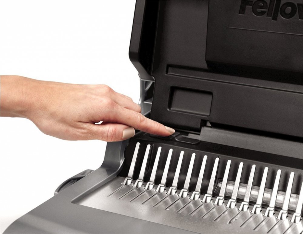 Vázací stroj pro děrování až 25 listů najednou. Vkládání děrovaných listů shora zajišťuje bezchybnou perforaci. Oddělená děrovací a vázací páka pro průběžné vkládání děrovaných listů do plastového hřbetu výrazně zefektivňuje práci. Stroj je vybaven zásobníkem na uložení hřbetů a integrovanou měrkou pro správnou volbu průměru.