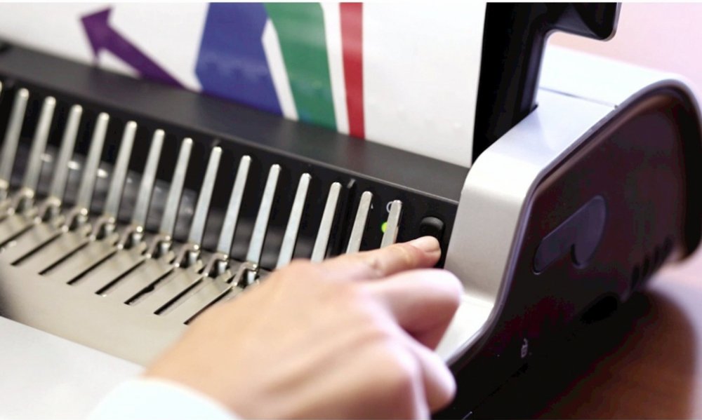 Stroj je vybaven větším zásobníkem na uložení několika plastových hřbetů a integrovanou měrkou pro správnou volbu průměruhřbetu. Na čelní straně stroje je průzor pro snadnou kontrolu zaplnění odpadního prostoru.