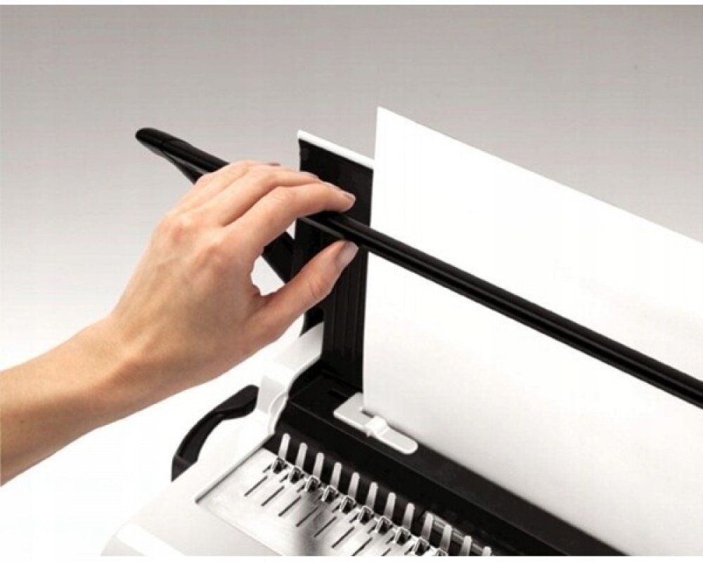Oddělená ergonomická děrovací a vázací páka pro průběžné vkládání děrovaných listů do plastového hřbetu výrazně zefektivňuje práci.