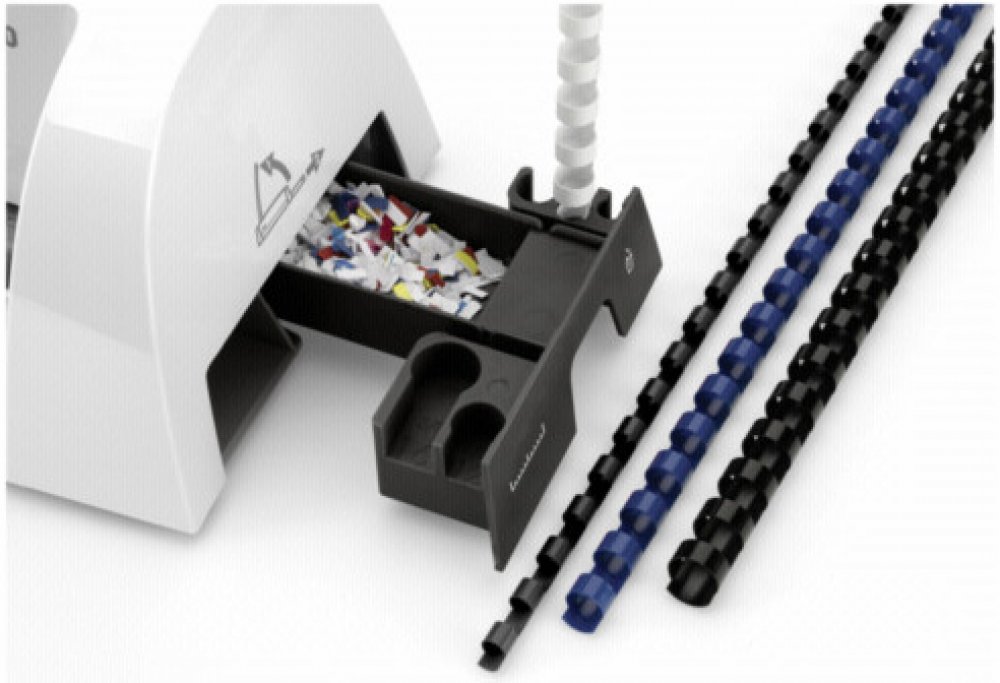 Oddělená děrovací a vázací páka pro průběžné vkládaní děrovaných listů do plastového hřbetu výrazně zefektivňuje práci. Díky delší děrovací páce je třeba k děrování minimum síly. Stroj je vybaven integrovanou měrkou pro správnou volbu průměru hřbetu.
