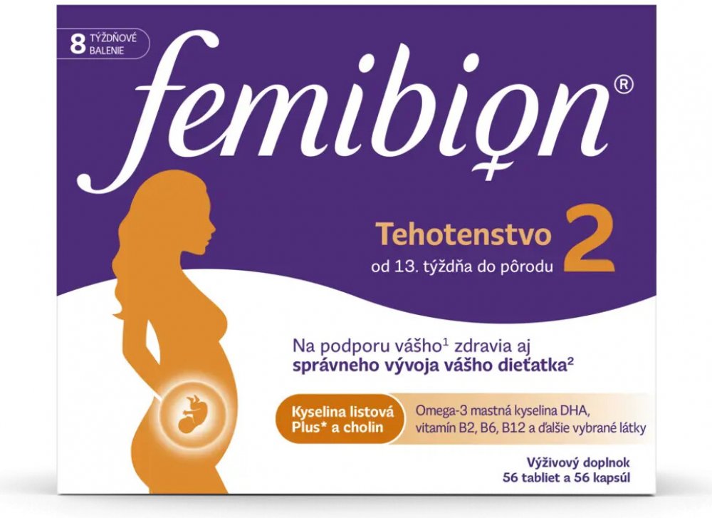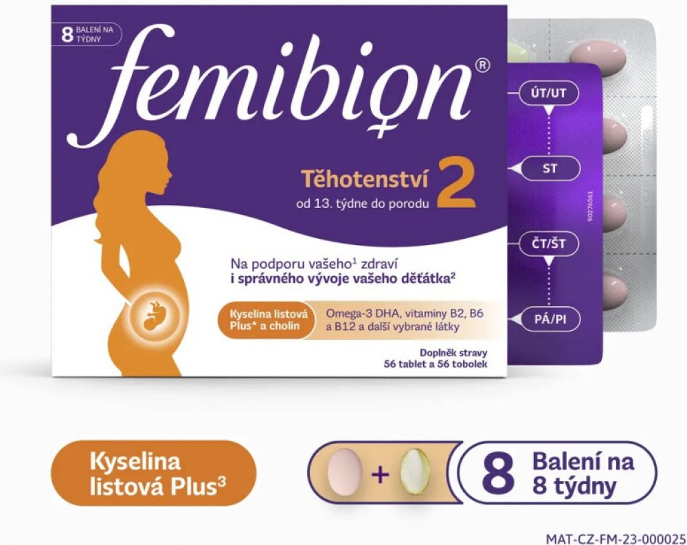 Vitaminy, minerály a další látky důležité pro Vás i Vaše miminko. Přípravek Femibion 2 Těhotenství je určen těhotným ženám od 13. týdne těhotenství až do porodu. V tomto období začíná fáze neuvěřitelně rychlého růstu Vašeho děťátka. Proto je důležité doplňovat foláty (metafolin® & kyselina listová) a omega-3 mastnou kyselinu DHA.