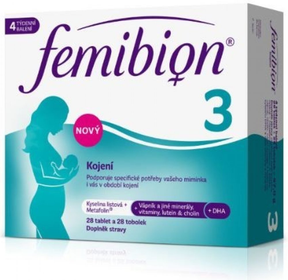 Femibion 3 je doplněk stravy je určen maminkám v období kojení. Femibion 3 obsahuje omega-3 mastnou kyselinu DHA, folát, vitamin A, vitamin D, železo, vápník, cholin a lutein. Neobsahuje lepek ani laktózu.