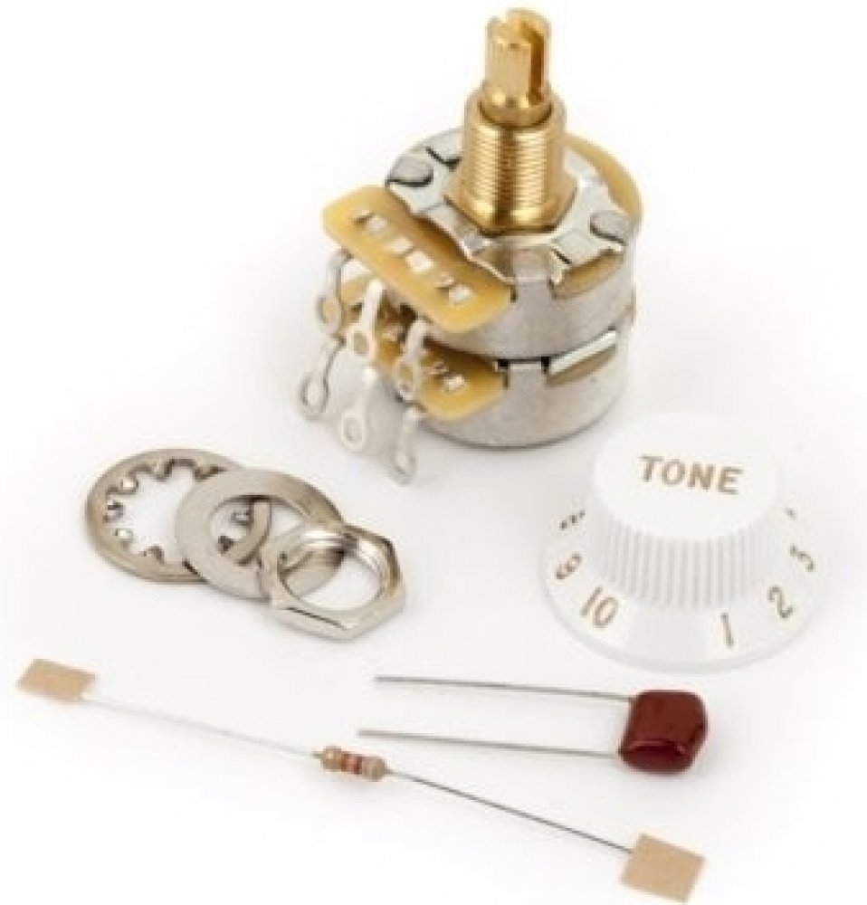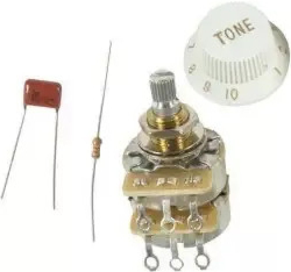 Speciální dvojitý potenciometr 250K/1Meg s aretací uprostřed dráhy, který zvyšuje tonální paletu vaší kytary. Při hodnotě 1 - 5 potenciometr funguje jako standardní ovládání pro tónovou clonu. Od hodnoty 5 výše snižuje odpor, díky čemuž zvyšuje propustnost signálu v celém spektru. Potenciometr nepotřebuje napájení pomocí baterie. Součástí balení je .022mf kondenzátor, 1/4W rezistor, knoflík bílé b...