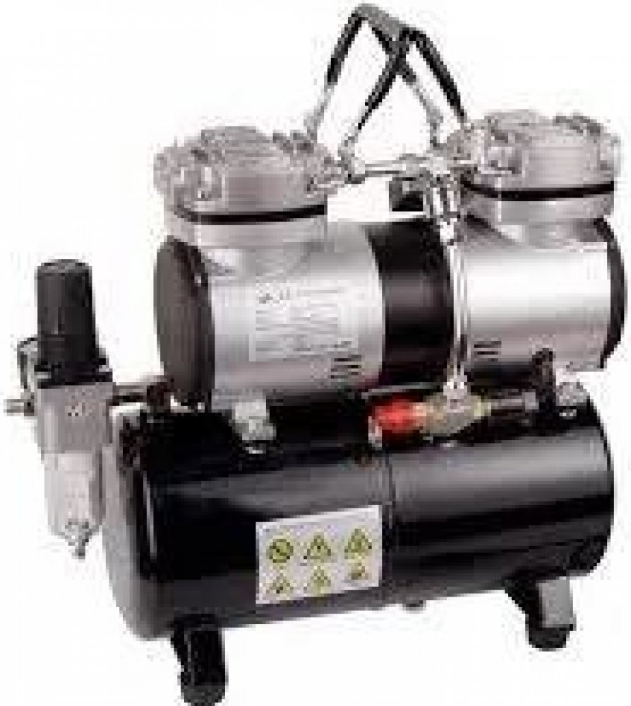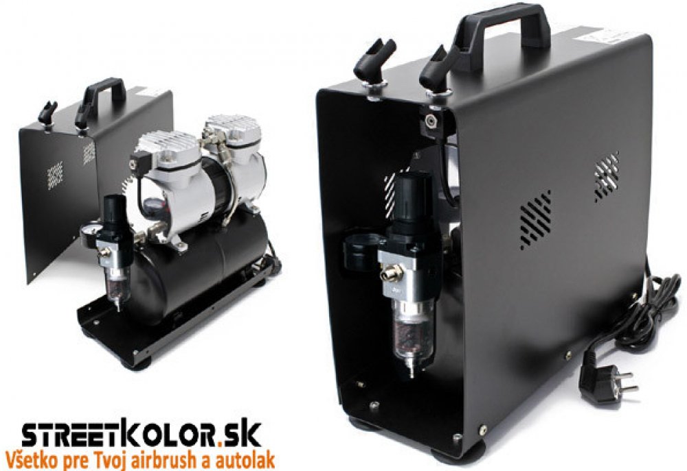 dvoupístový bezolejový mini kompresor s plechovým krytem (neznečišťuje se výstupní vzduch olejem) vhodný pro všechny druhy airbrush stříkacích pistolí