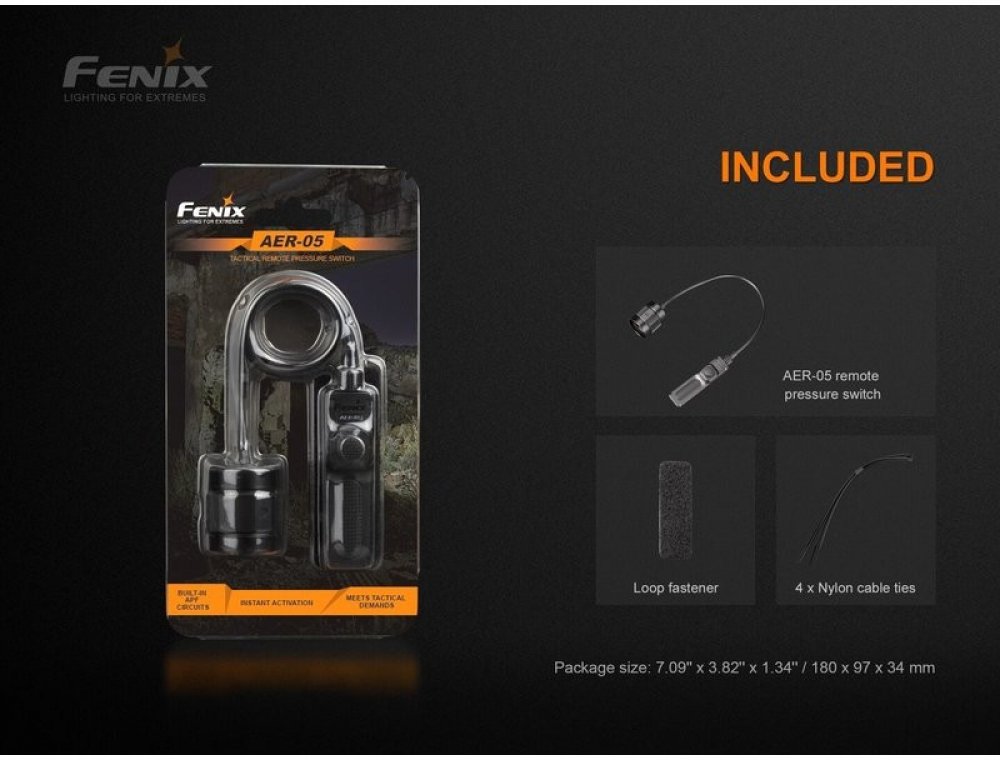 Vhodné pro použití se svítilnou montovanou na dlouhé zbrani. Na konci kabelu jsou umístěny dva bezhlučné spínače. Jeden tlačítkový s funkcí momentální aktivace namáčknutím a rovněž možností trvalého rozsvícení svítilny (vždy do maximálního výkonu) a druhý plochý tlakový spínač pro zapnutí stroboskopu. Spínač je navíc opatřen suchým zipem, což vám pomůže s jeho umístěním kamkoliv na zbraň. K uchycení spínače na zbraňovou lištu doporučujeme dokoupit montáž Fenix ALG-05.