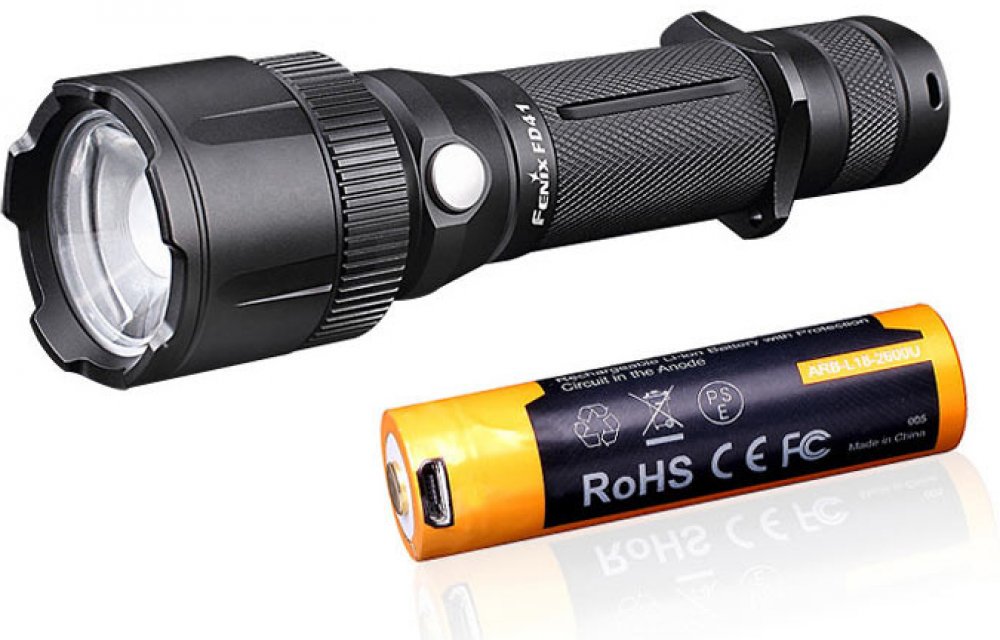 Cenově zvýhodněná sada taktické zaostřovací svítilny Fenix FD41 a Li-ion akumulátoru Fenix 18650 2600 mAh se zabudovaným micro-USB konektorem.