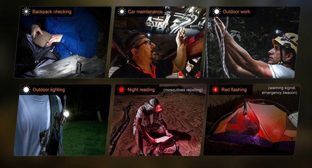 Čtyři režimy červeného světla: 5 lumenů (36 hodin) -> 1 lumen (100 hodin) -> červené blikání 5 lumenů (72 hodin) -> SOS 5 lumenů (72 hodin)