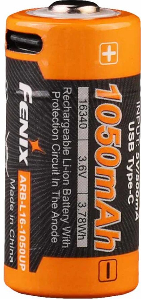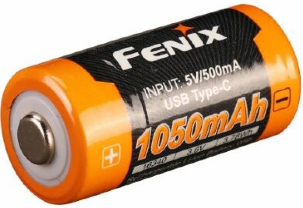 Dobíjecí baterie RCR123A 1050 mAh USB-C (Li-ion) - Fenix je výkonný Li-ion akumulátor velikosti RCR123A (16340) s kapacitou 1050 mAh a integrovaným USB-C konektorem pro pohodlné nabíjení. Díky této konstrukci lze baterii nabíjet přímo pomocí USB-C kabelu například z počítače, powerbanky nebo síťové nabíječky mobilního telefonu. Zároveň ji lze dobíjet i v klasických Li-ion nabíječkách nebo přímo v kompatibilních nabíjecích svítilnách.