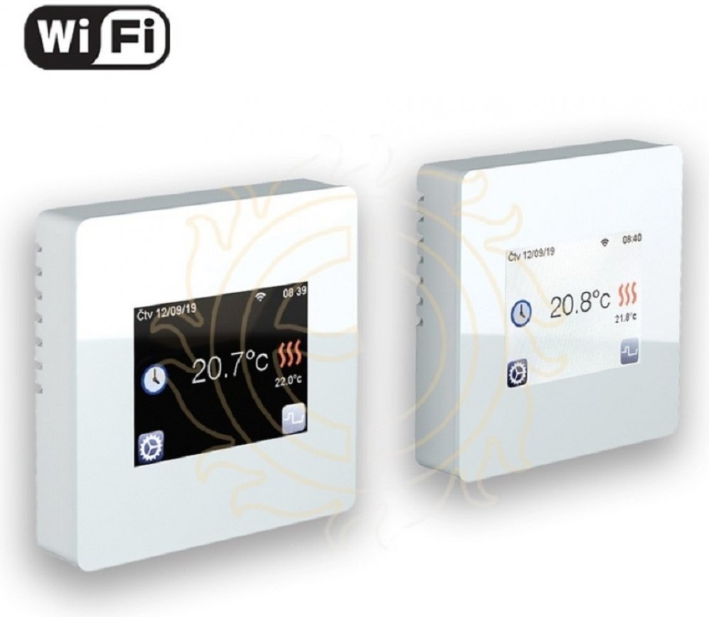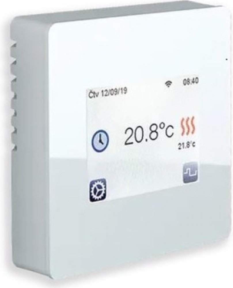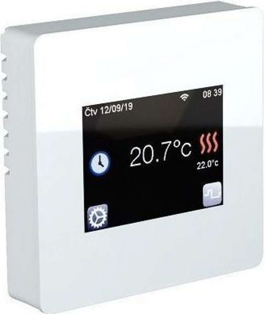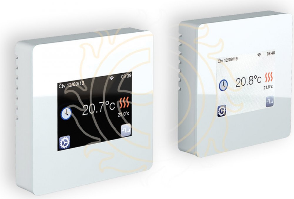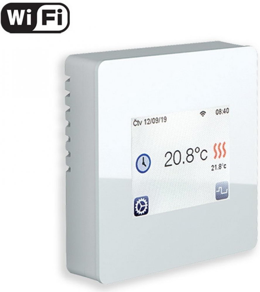 Integrovaným wifi modul pro připojení k domácí síti, vzdálené ovládání pomocí cloud serveru (aplikace pro iOS, Android), barevný dotykový displej, CZ menu. Uživatelsky volitelné snímaní teplot (jen prostoru, podlahy, nebo obou...