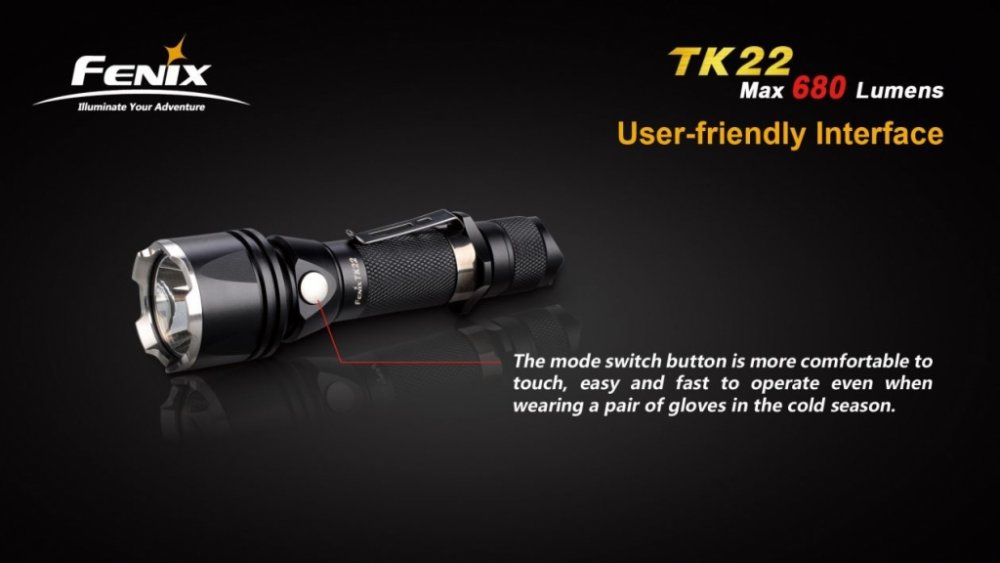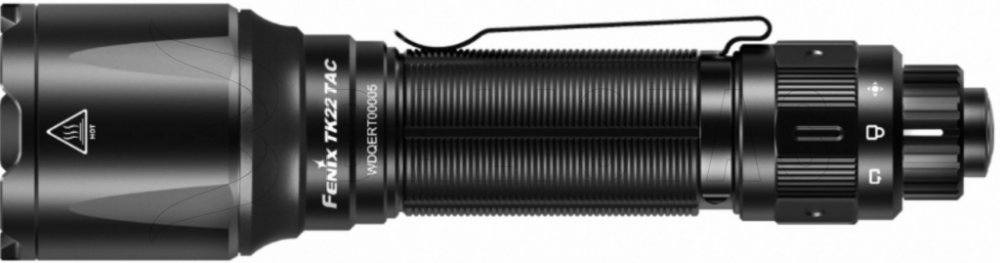 Taktický mód (otočný ovladač v levé poloze): Pro zapnutí zmáčkněte taktické tlačítko na konci svítilny, pro okamžitou aktivaci tlačítko namáčkněte. Svítilna se vždy aktivuje v nejvyšším režimu. Pro aktivaci stroboskopu podržte tlačítko stisknuté po dobu 0,8 vteřiny (i z vypnutého stavu). Namáčknutím se svítilna vrátí do původního režimu. Stisknutím tlačítka se svítilna vypne.