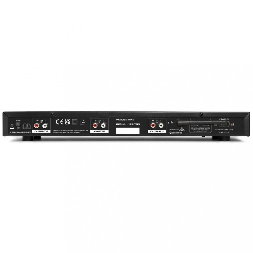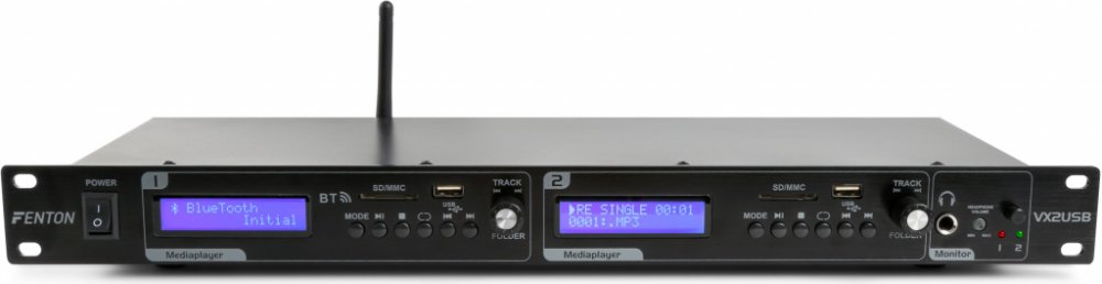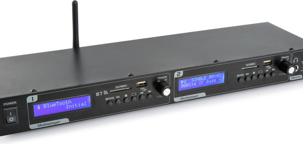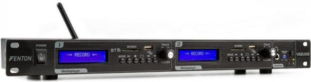 Dvojitý multimediální přehrávač v kompaktním 19“ provedení do racku. Přístroj je vybaven Bluetooth přijímačem pro přehrávání hudby z mobilních zařízení (chytré telefony, tablety apod.) u levého přehrávače a USB portem a SD/MMC slotem pro paměťová média u obou přehrávačů. Oddělené RCA výstupy obou přehrávačů, společný RCA výstup obou přehrávačů, funkce nahrávání (ve formátu MP3, 128 kb , ID3). Sluc...