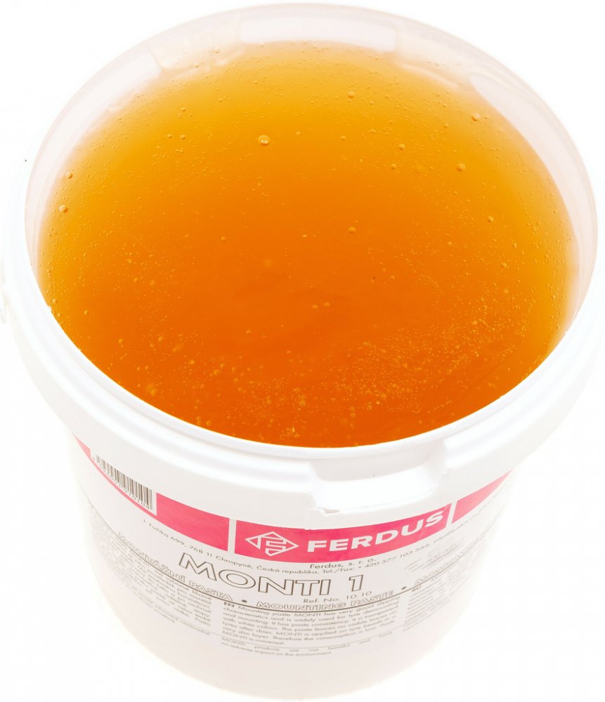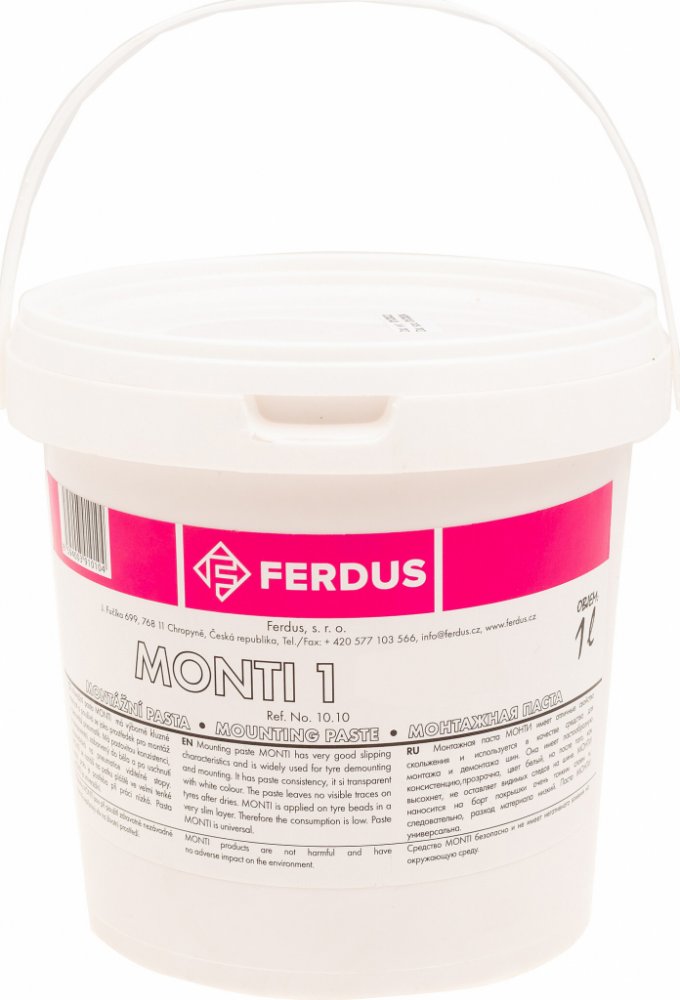 Montážní pasta MONTI 1, objem 1000 ml – Ferdus 10.10 Montážní pasta MONTI 1 má výborné kluzné vlastnosti a používá se jako prostředek pro montáž a demontáž pneumatik. Má pastovitou konzistenci, je transparentní, a po uschnutí nezanechává na pneumatice viditelné stopy. MONTI se nanáší na patku pláště ve velmi tenké vrstvě a proto je spotřeba při práci nízká. Pasta MONTI je univerzální, používá se při montáži a demontáži pneumatik jízdních kol, motocyklů a osobních a lehkých nákladních vozidel. Balení: 1 ks kyblík o objemu 1 litr