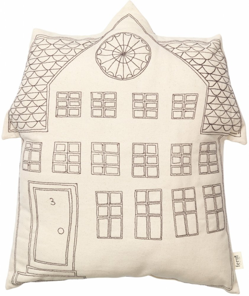 Tvar polštáře věrně kopíruje vyšívanou perokresbu znázorňující vysoký řadový dům s popisným číslem tři a výrazným oknem, které d...