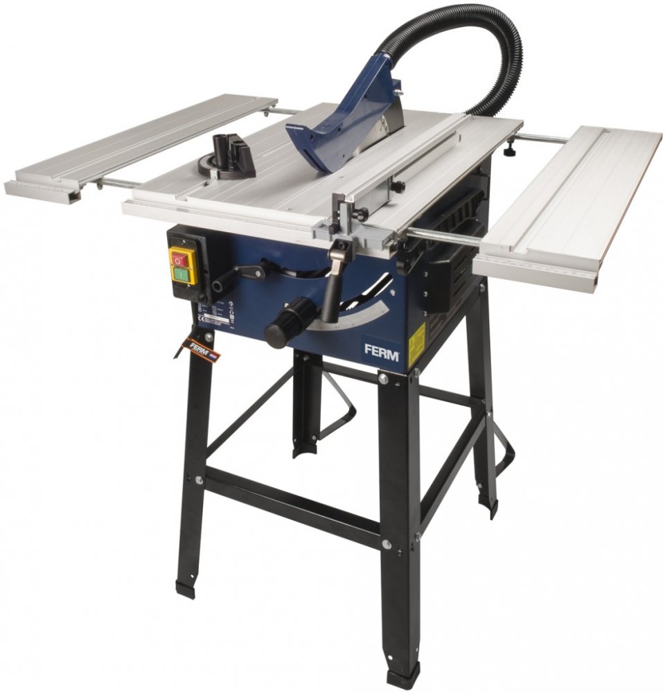FERM TSM1033 stolní kotoučová pila·Paralelní doraz·Úhlový doraz·Posuvné vodítko·Ochranné brýle·Špunty do uší·Pilový kotouč TCT 250 mm (T40)
