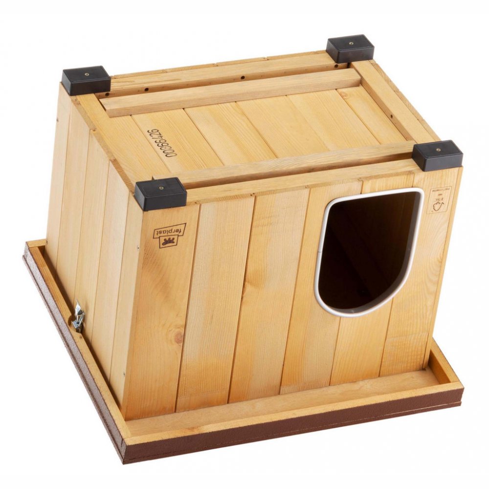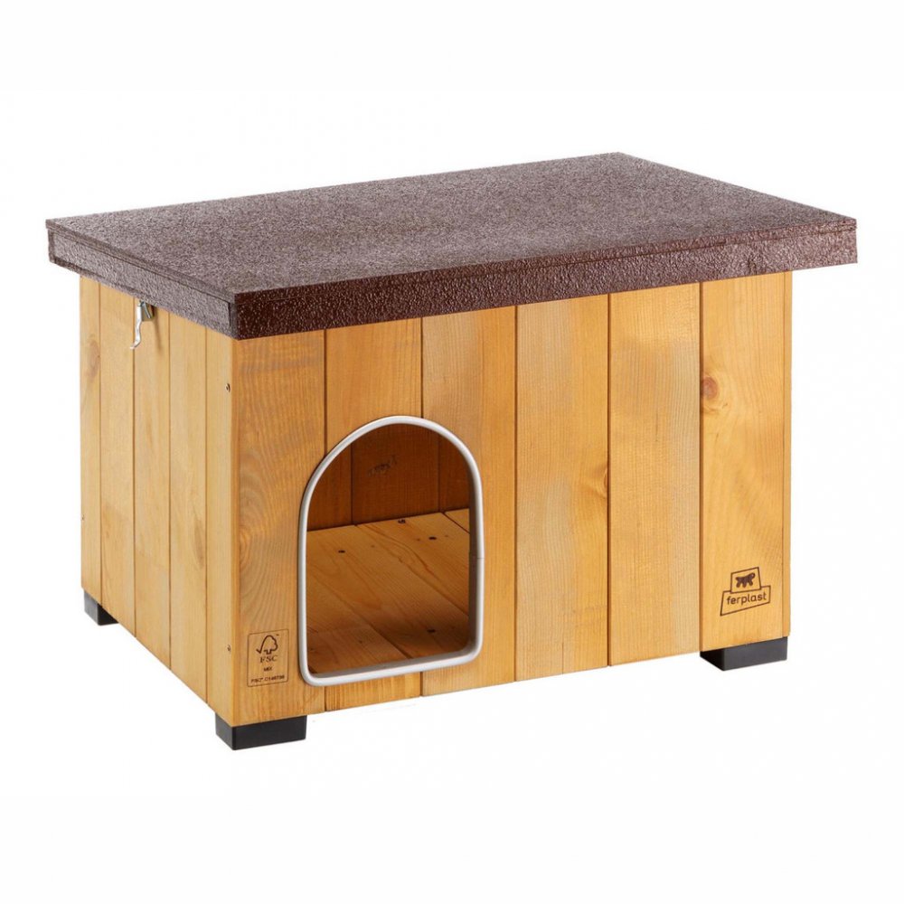 Boudy a dvířka Dřevěná bouda Ferplast Baita 50: vyrobeno z odolného borovicového dřeva s certifikací FCS™, ekologický, netoxický a protiplísňový nátěr s UV ochranou, otevíratelná střecha pro snadné čištění, voděodolný povrch střechy ošetřený pryskyřicí, plastové patky pro lepší izolaci od země, vnější rozměry: 56 × 46,5 × 41,5 cm, vnitřní rozměry: 49 × 34,5 × 34,5 cm.