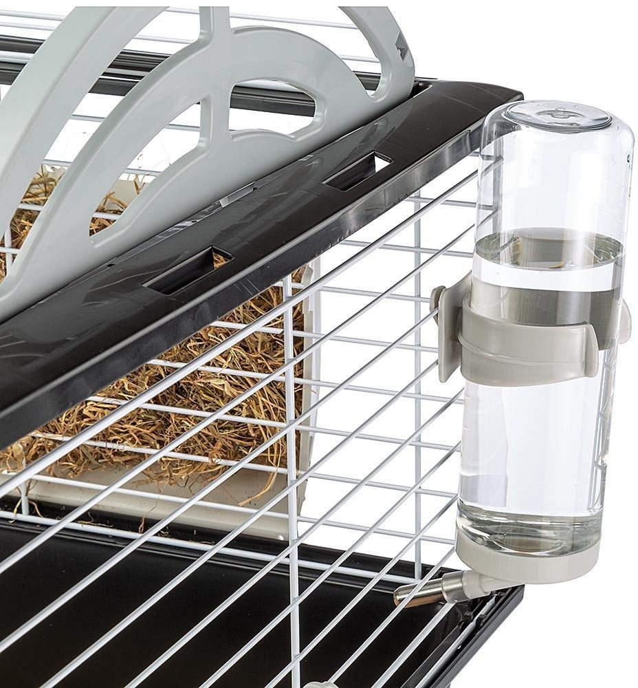 Klenutou horní část klece je možné otevřít. Malé bezpečnostní sponky zabraňují otevření horní části klece samotným zvířátkem. Klenutý tvar střechy poskytuje zvířatům větší možnost pohybu, což ocení zejména králíčci. Moderní lem dodává střeše dojem elegantní kopule. Klec je také možné otevřít pomocí zasunovacích dvířek v přední části klece. Zasunovací dvířka umožňují přizpůsobit šířku otevření a zároveň snižují riziko zranění. Pokud je necháte otevřená, zvířátka mohou bez problémů do nebo z klece. V zavřeném stavu jsou dvířka jištěna příčkou, aby se morče nebo králíček nedostali z klece ven!