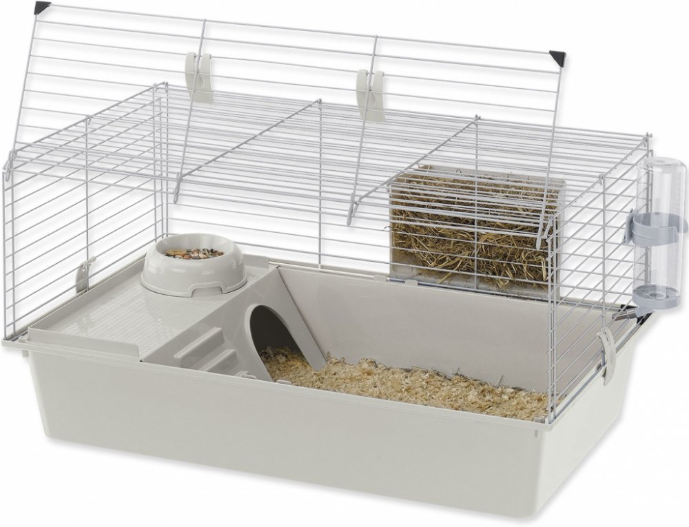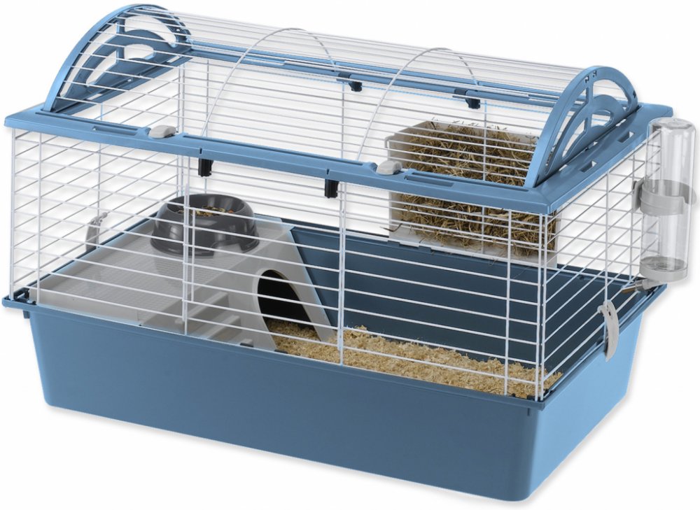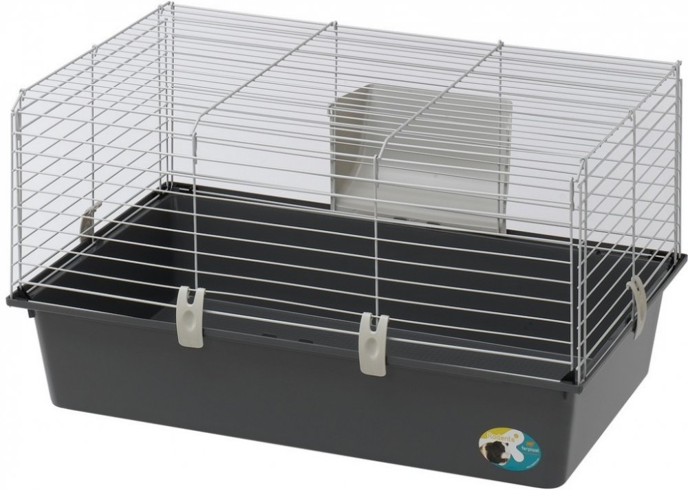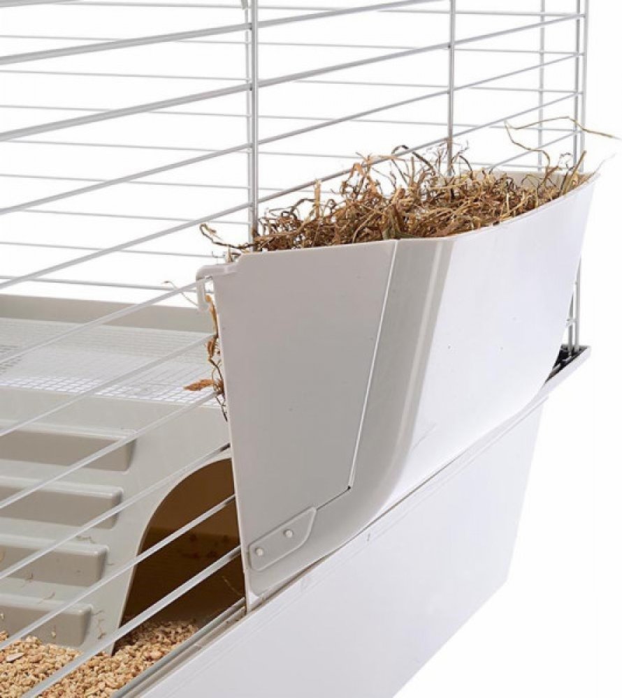 Klec má tradiční konstrukci s plastovou základnou, která tvoří úkryt a jejíž součástí je i miska na krmení. Dveře na přední straně mohou být zcela otevřené pro snadné čištění. Součástí klece jsou i jesle na seno a napaječka.