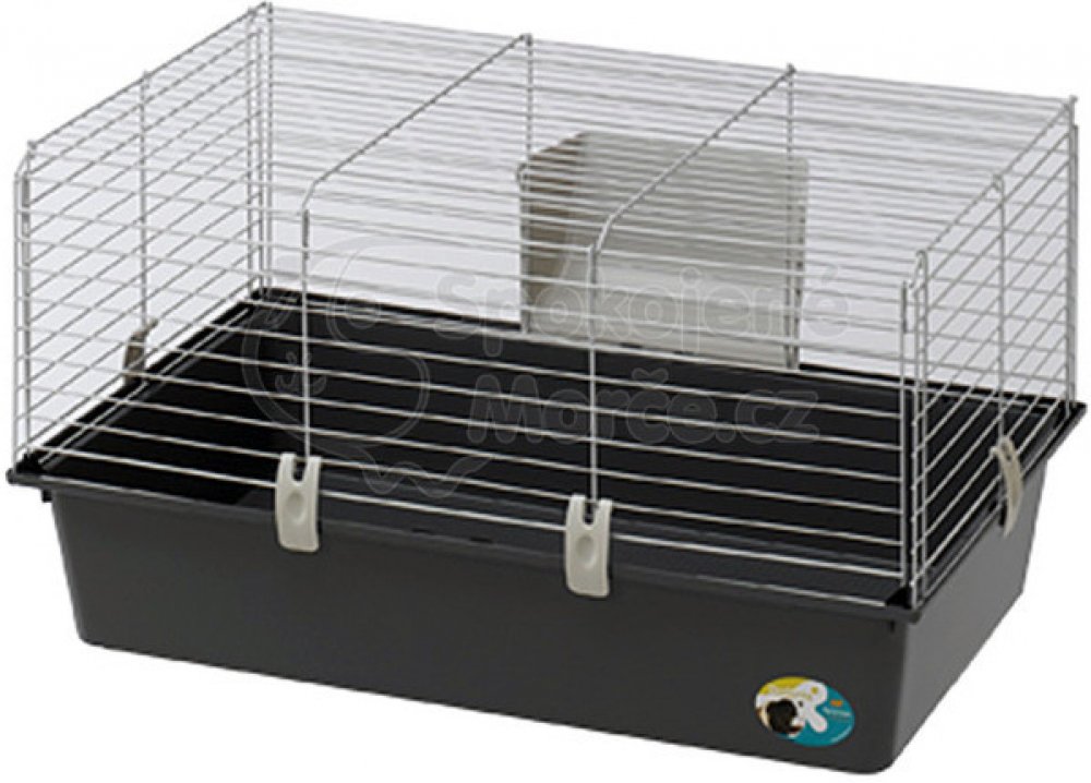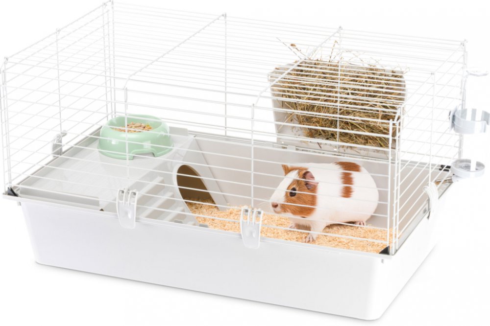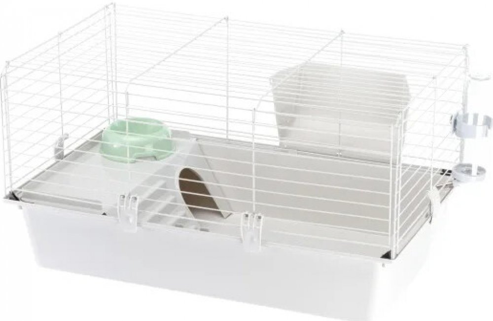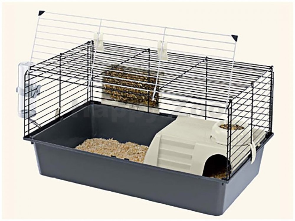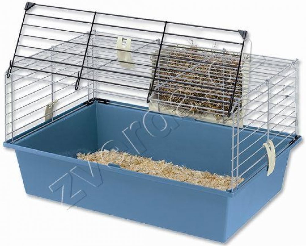 Klec má tradiční konstrukci s plastovou základnou, která tvoří úkryt a jejíž součástí je i miska na krmení. Dveře na přední straně mohou být zcela otevřené pro snadné čištění. Součástí klece jsou i jesle na seno a napaječka.