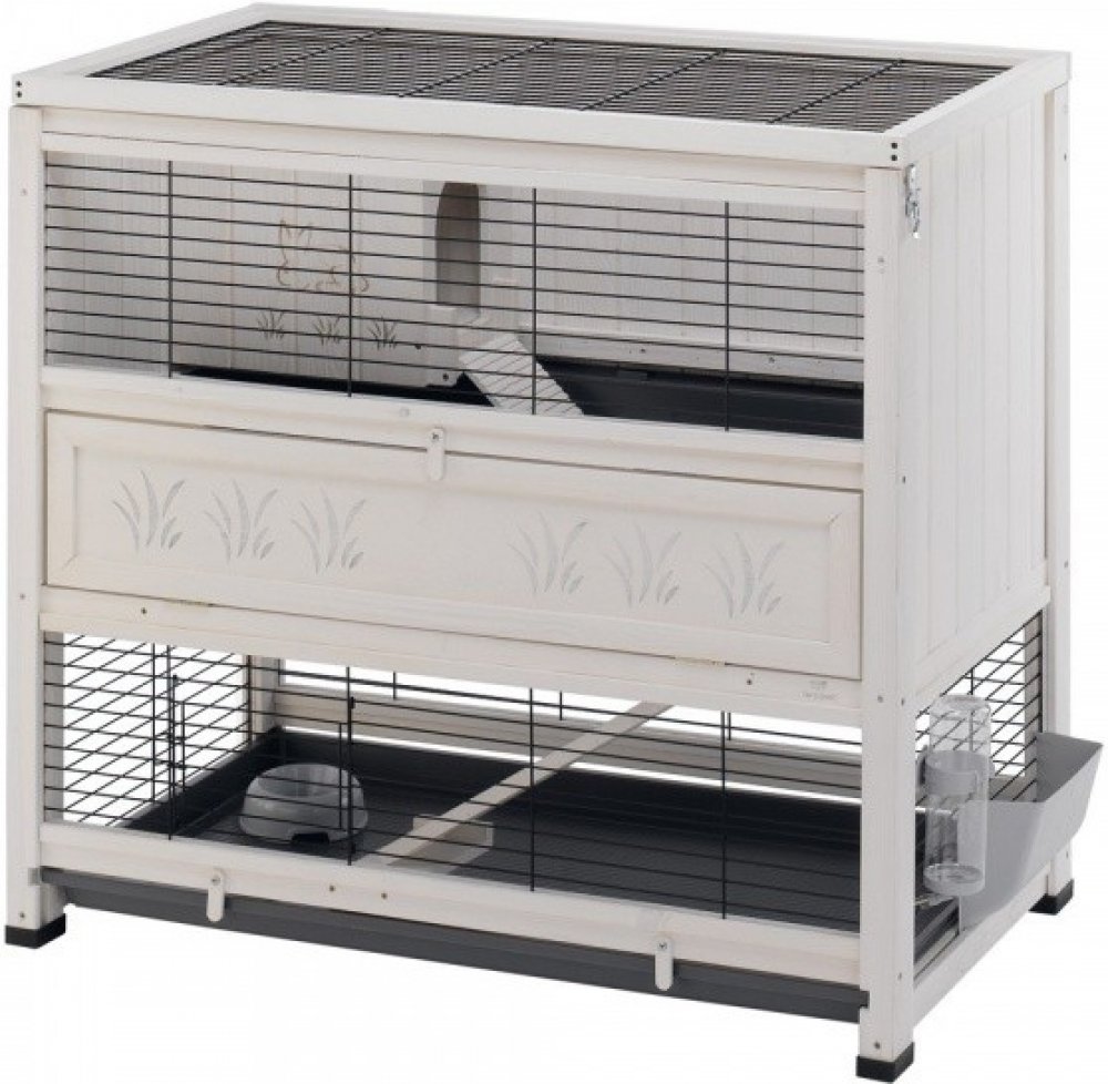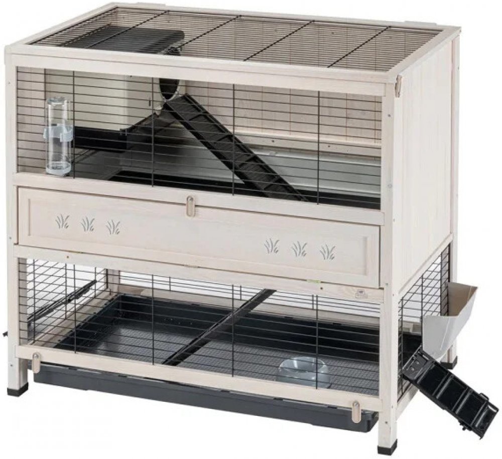 Tato dřevěná klec do interiéru domu přesvědčí nejen svým elegantním vzorem, ale také funkčností. Králíci a morčata si mohou procházet dvěma patry klece a pak se usadit ke spaní na speciálně připraveném samostatném místě. Spodní strana v prvním patře má obzvláště vysoký okraj, takže zvířata mohou bez problémů trochu zařádit, aniž by si ušpinila váš domov. Střecha je otevíratelná. V přízemí se nachází posuvná mřížka pro pohodlné nastupování a vystupování z klece a také pro její čištění. Navíc je spodní část v přízemí vyrobena z plastu, který se snadno čistí a lze jej vyjmout. Samostatný domeček na spaní má také otevírací střechu.