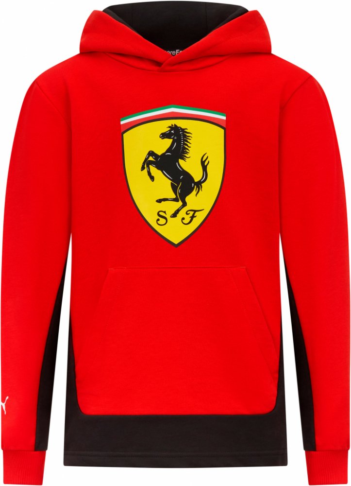 Mikina s velkým logem Ferrari na přední straně z kolekce 2023.