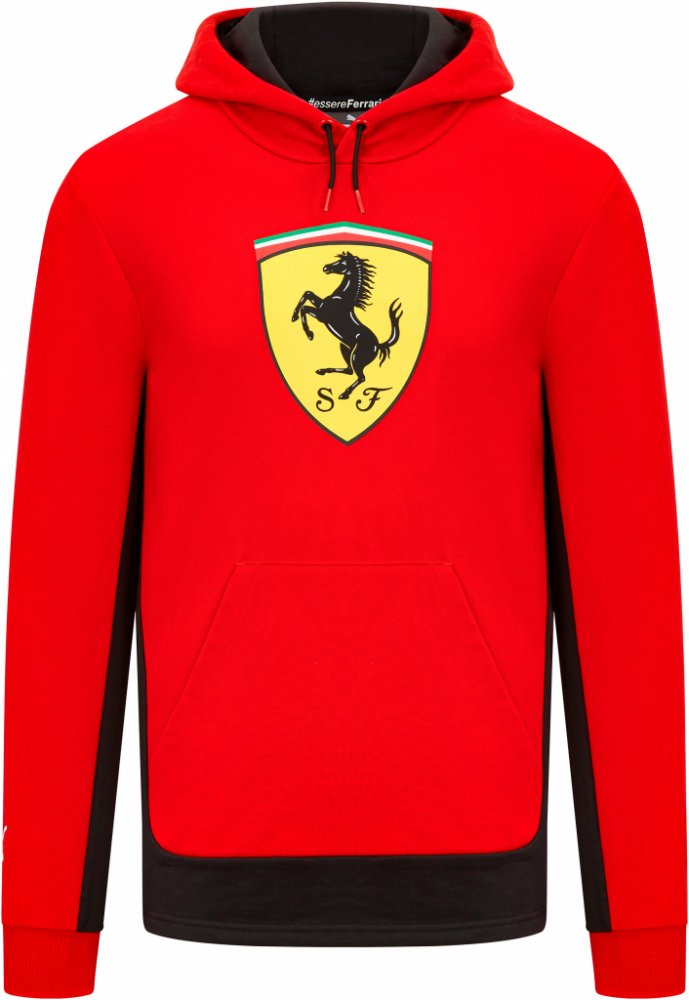 Mikina s velkým logem Ferrari na přední straně z kolekce 2023.