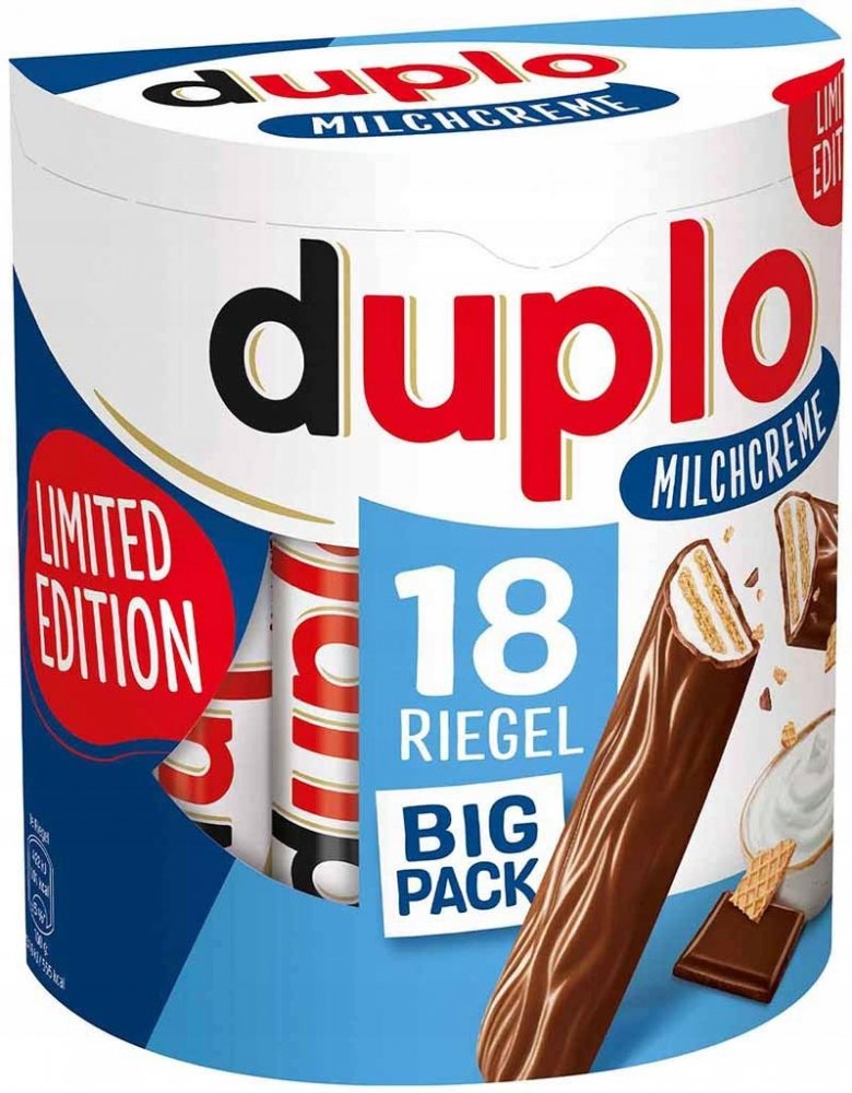 ▶ Limitovaná verze Ferrero duplo Milk Cream Big Pack (18 tyčinek)▶ Duplo je nejen nejdelší pralinkou na světě, ale také lahodnou svačinka.▶ Ferrero duplo Milk Cream, neodolatelná kombinace jemného mléčného krému s jemnými oplatkami, zalitá lahodnou mléčnou čokoládou.▶ Balení obsahuje 18 tyčinek