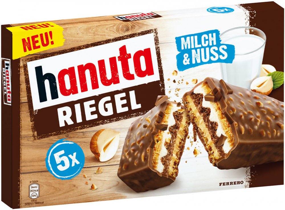 Lahodný mléčný a oříškový krém mezi křupavými oplatkami, zalitými jemnou mléčnou čokoládou s křupavými kousky oříšků. Tyčinka Hanuta boduje svou jedinečnou chutí, této tyčinky se nemůžete nabažit. Perfektní svačina pro rychlý hlad a na cesty.