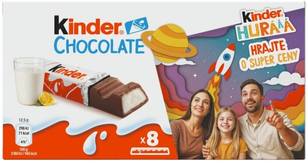 Díky své receptuře s lahodnou krémově mléčnou náplní je Kinder Chocolate dokonalým malým pamlskem speciálně vytvořeným pro děti a spokojené maminky. Kinder Chocolate neobsahuje žádná umělá barviva ani ztužené tuky. Každá tyčinka dětské velikosti...