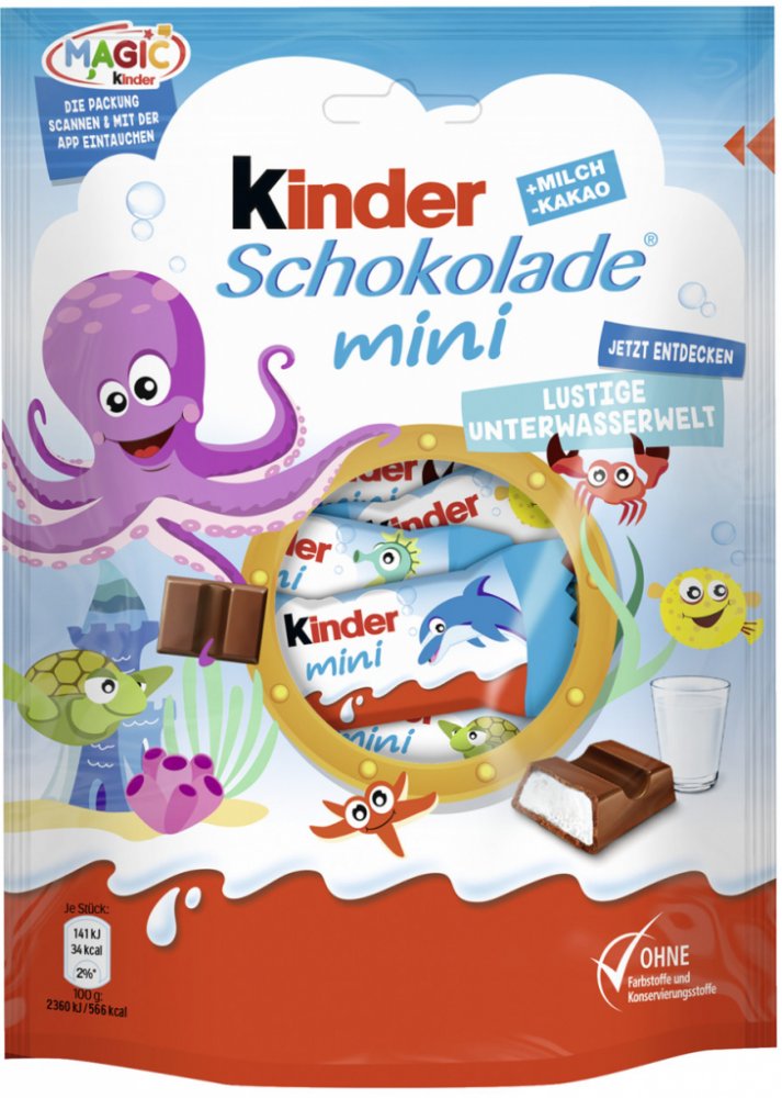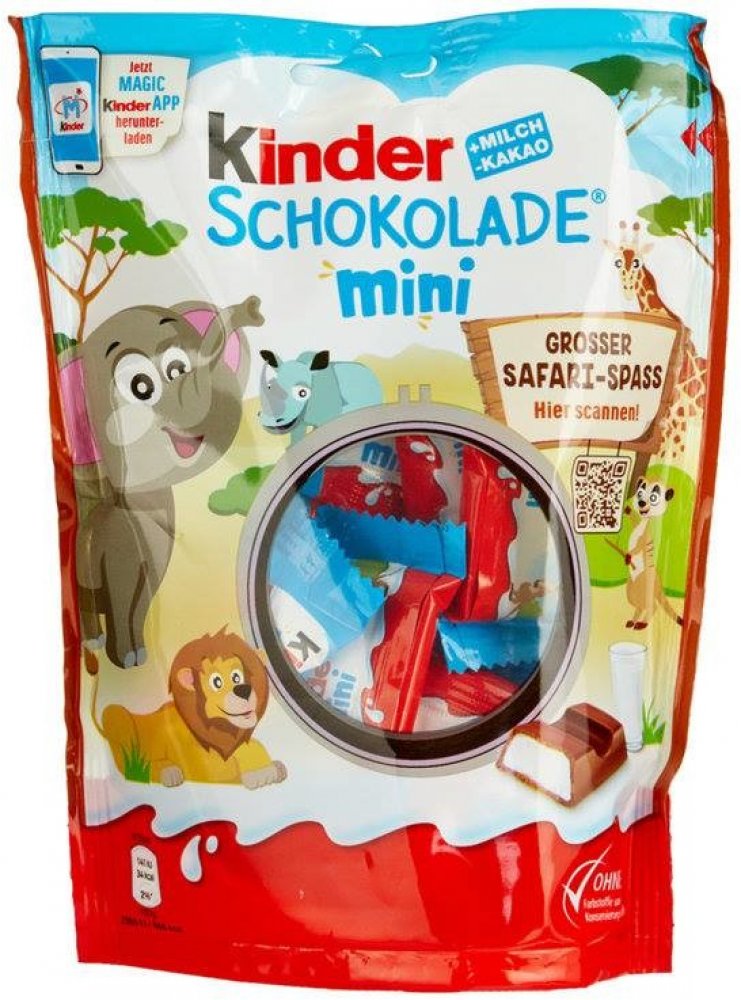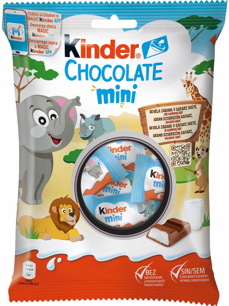Kinder Chocolate neobsahuje žádná umělá barviva ani ztužené tuky. Každá tyčinka dětské velikosti je zabalená samostatně.